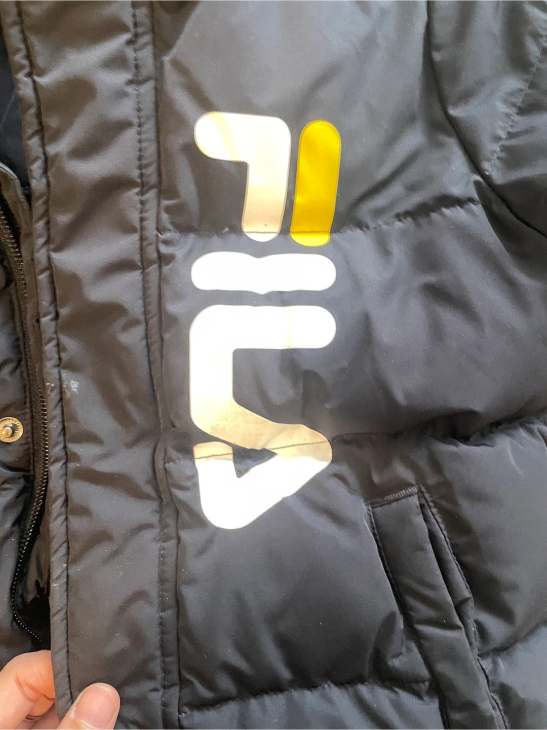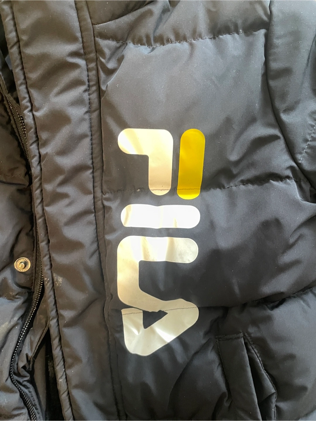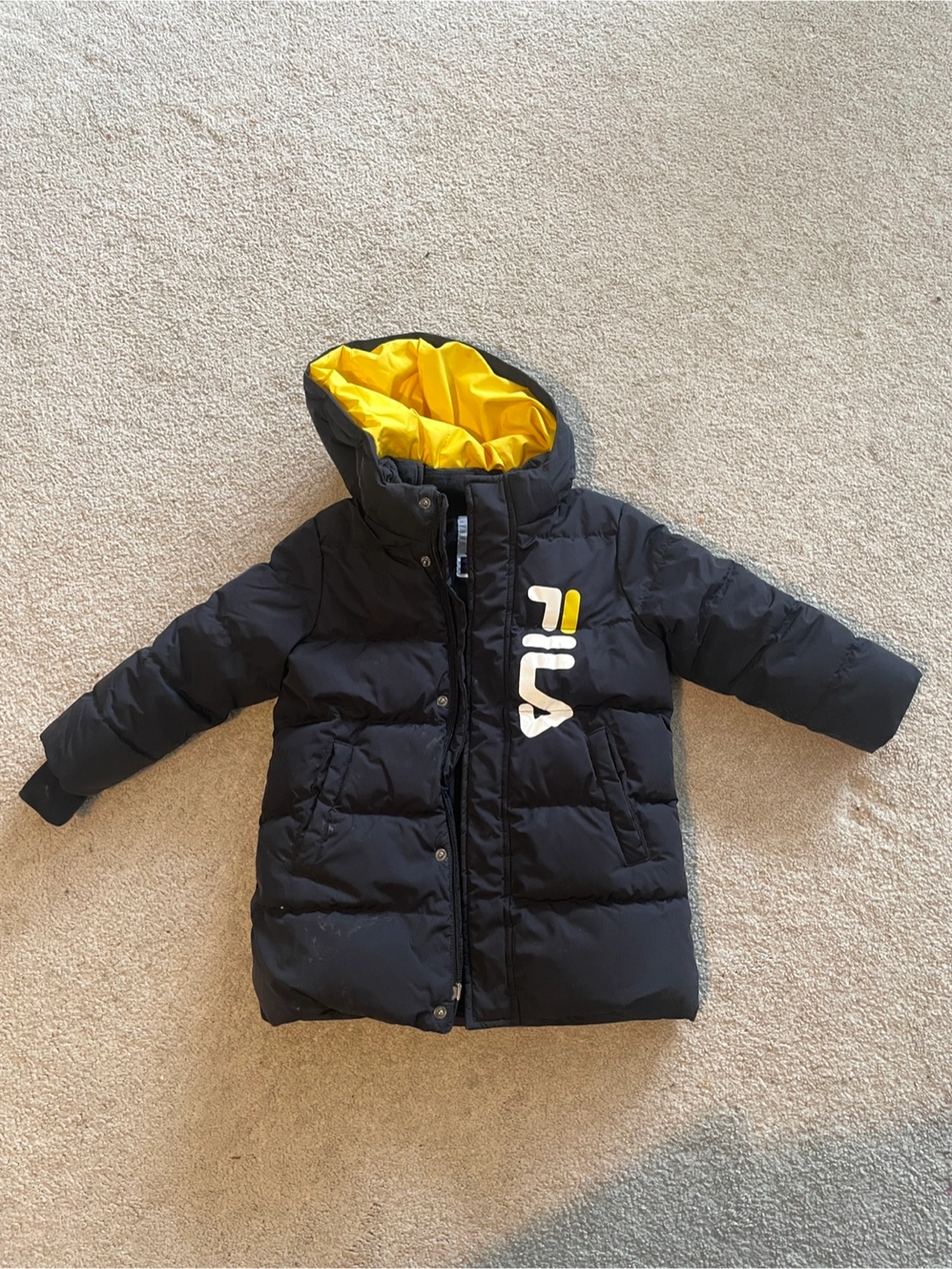 Black puffer jacket for kids by Fila. It features a bright yellow lining and the Fila logo on the front. The size is 110/52, which corresponds to a kids' size 105. It's a warm and stylish option for colder weather!