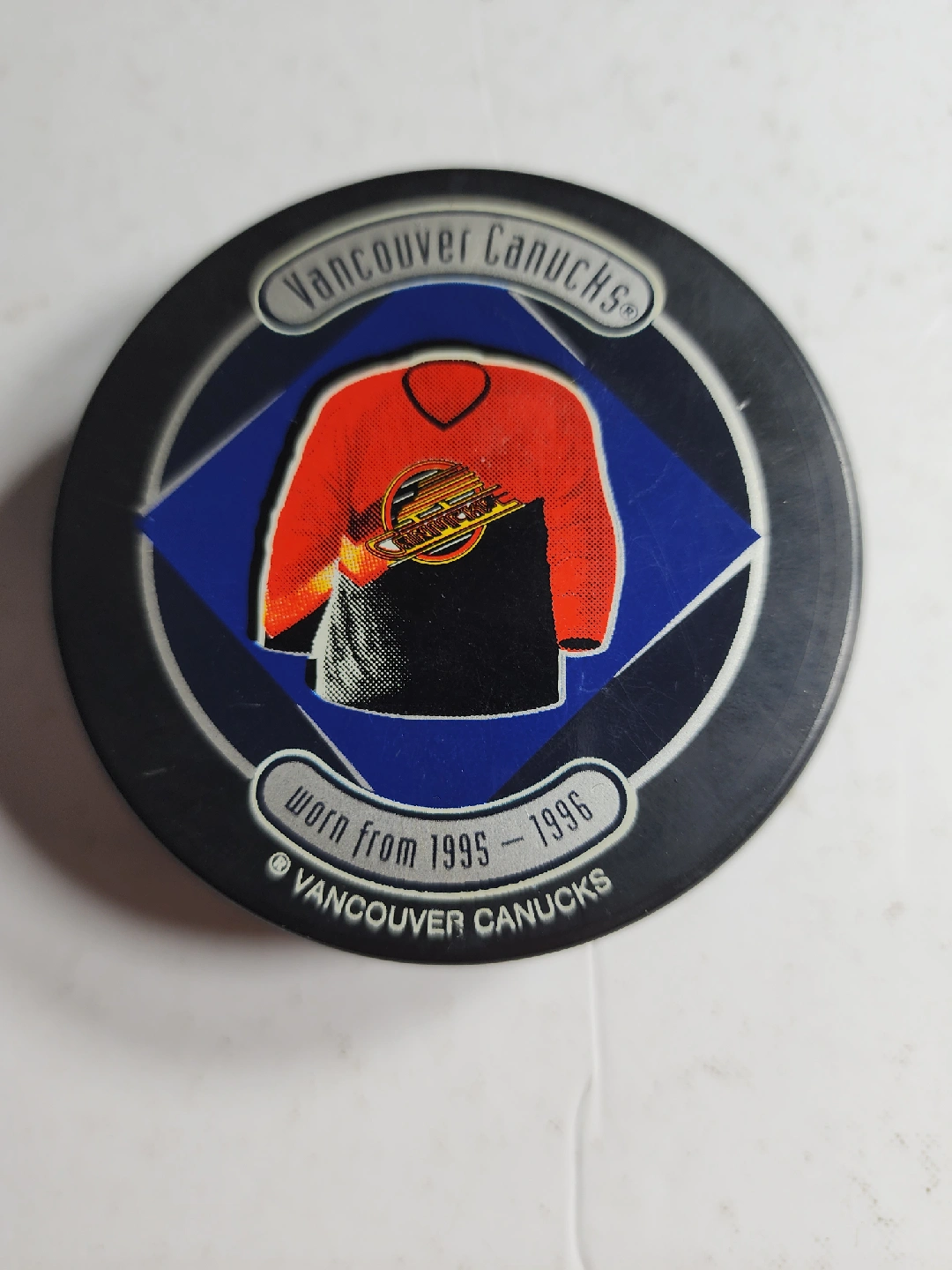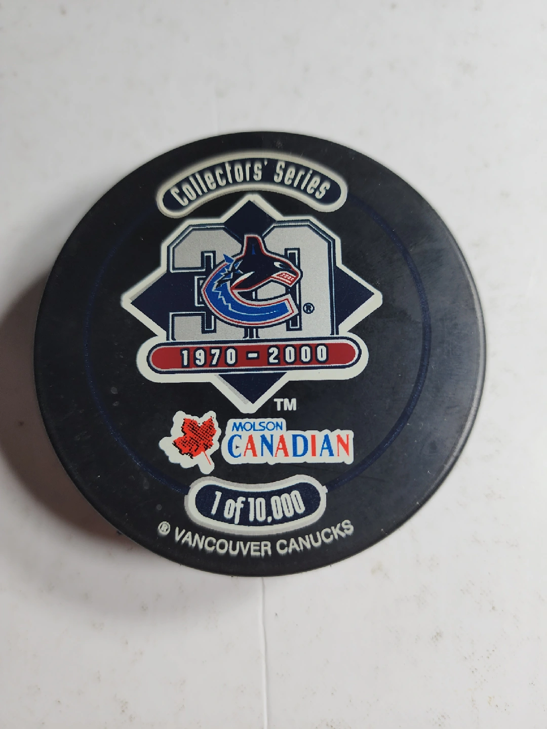 Selling a Vancouver Canucks Collectors' Series hockey puck. It commemorates the years 1970-2000 and is marked as 1 of 10,000. The reverse side shows the jersey worn from 1995-1996. A great piece for any Canucks fan!