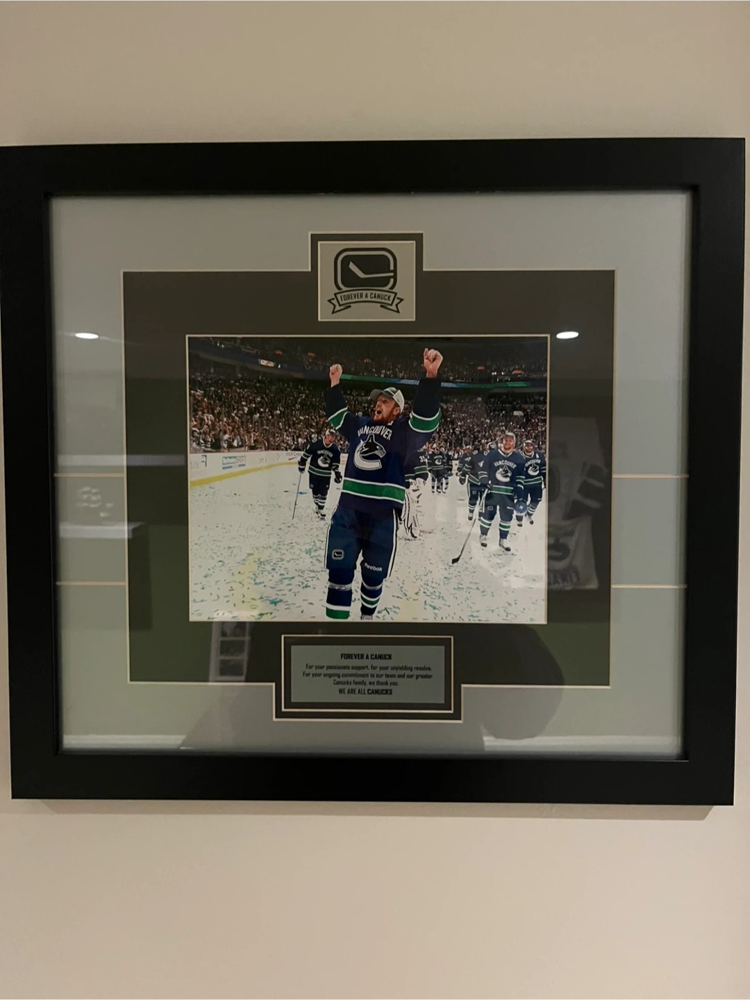 10Selling a framed picture of the Vancouver Canucks. It says "Forever A Canuck" and "We Are All Canucks".