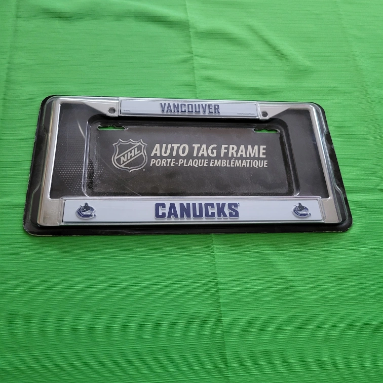 29Metal licence plate frame. Features Canucks logo and NHL shield. Chrome finish. Vancouver text at top. Can Deliver.