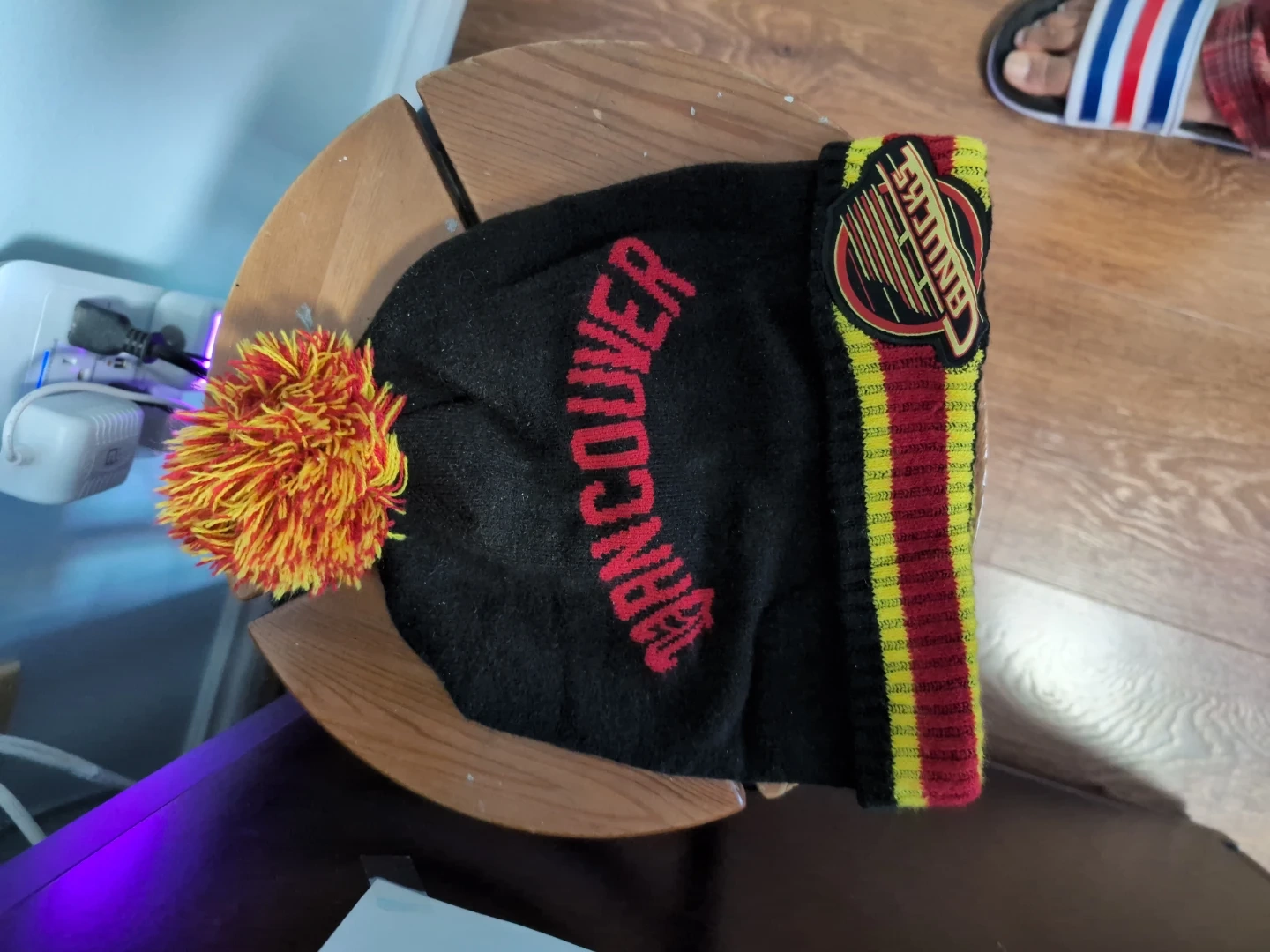 10Selling a Vancouver Canucks beanie! It's black with the team name in red and has a fun pom-pom on top. The team logo is featured on the side. Perfect for showing your Canucks pride!