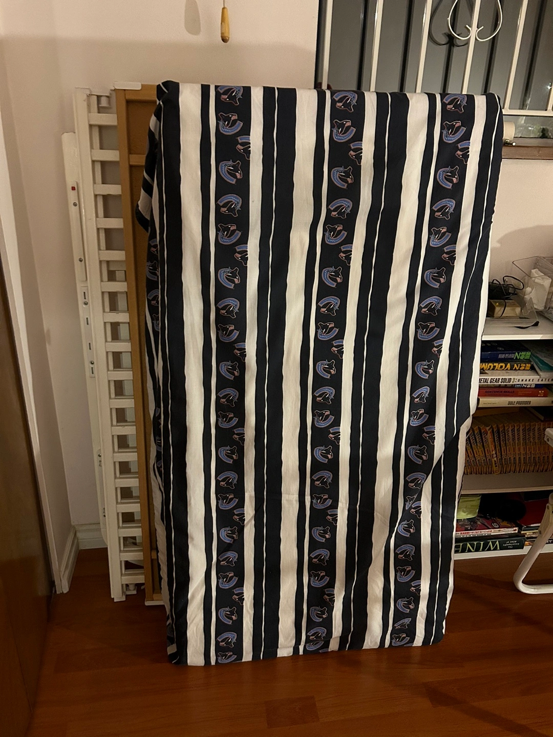 82Vancouver Canucks striped pattern bed sheet sets with a crib and mattress. It's in good condition and would be perfect for a kids room or a Canucks fan's space. It has always been a spare bed for both of my kids. Free & pick up only