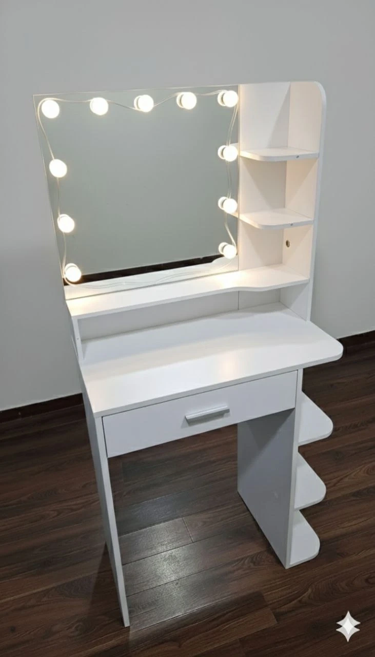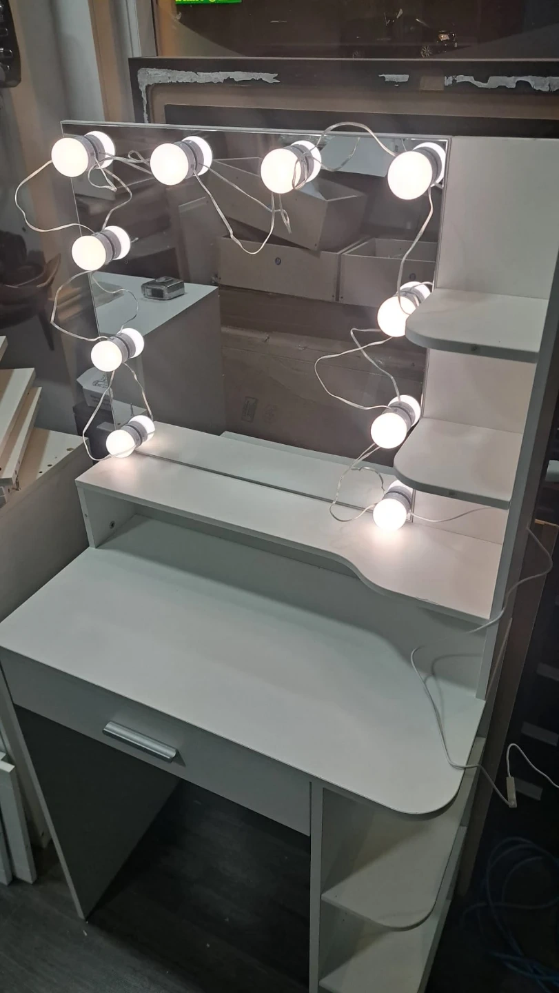 54Selling a vanity makeup desk with a lighted mirror. It's in great condition and would be perfect for anyone needing a dedicated space for getting ready. The desk features a drawer and some shelves for storage.