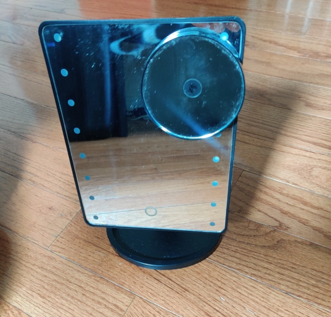34A black vanity mirror with a magnifying lens on one side. It has a stand on the bottom and lights surrounding the mirror. Mirror has lights along the edges that are battery operated and a tiny 5x zoom mirror that can be attached or used separately. Perfect for tabletop, makeup or skincare . Battery not included