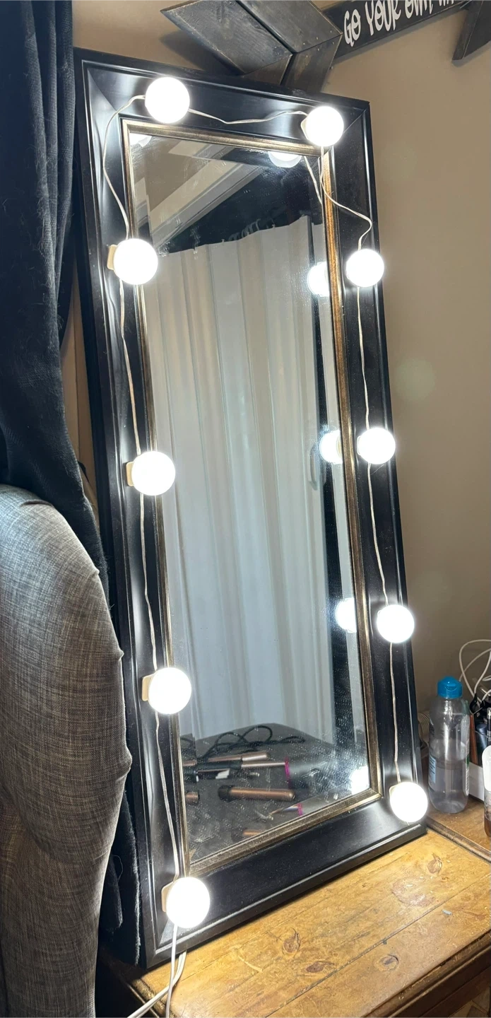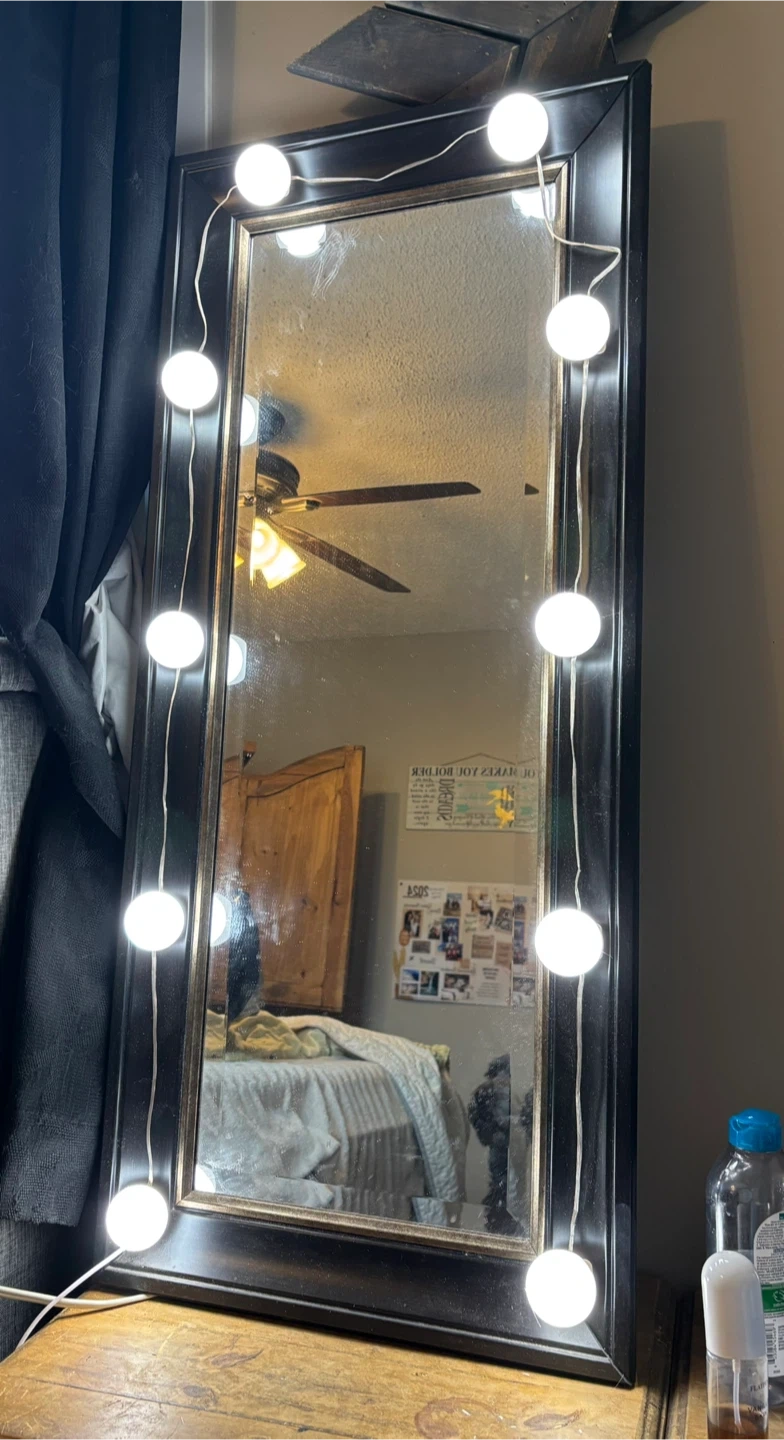 65Here's a vanity mirror with lights around the frame! It's in great condition and ready to brighten up your space. Perfect for getting ready or adding a touch of Hollywood glam to your room