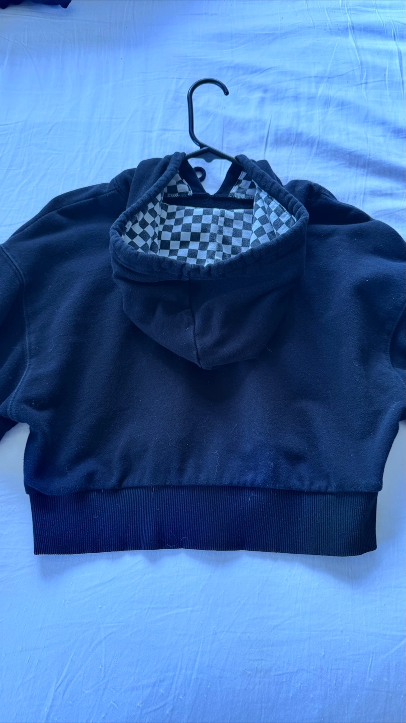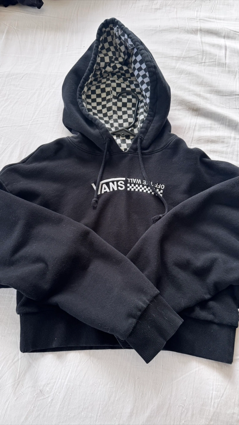 15Black cropped hoodie. Checkered pattern inside the hood. Vans logo on the front. Good condition.