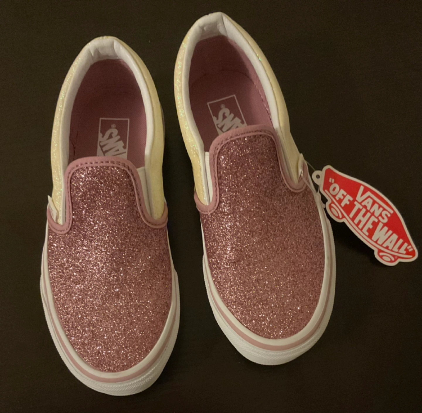 Selling brand new (never worn) pink glitter slip-on Vans shoes in Size 1 US Kids. *firm price* selling for $40.