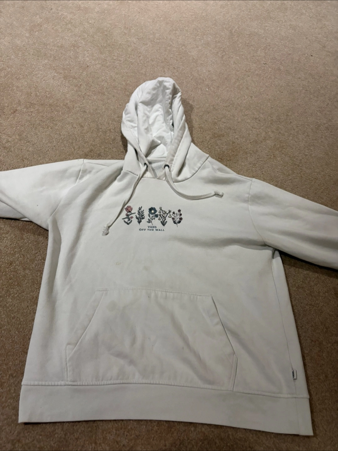Selling a Vans "Off The Wall" hoodie with a cute floral design. It's a comfy hoodie, perfect for everyday wear. There are a few spots on the front, as shown in the photos, but otherwise it's in good condition