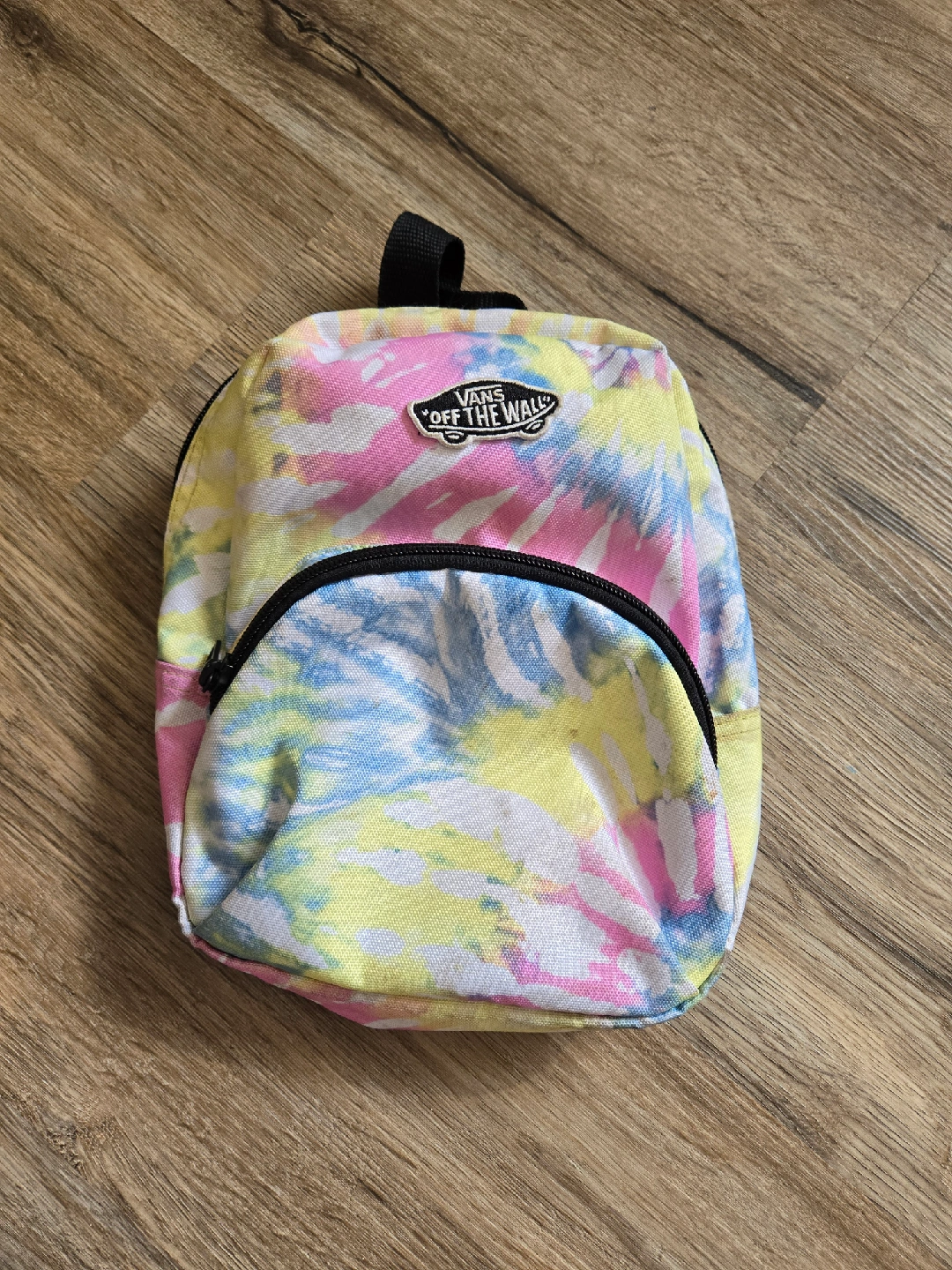 Selling a cute Vans mini backpack with a fun tie-dye pattern! It's in great condition and perfect for carrying small essentials. The iconic 'Off The Wall' logo is featured on the front. It's a stylish and practical accessory for everyday use