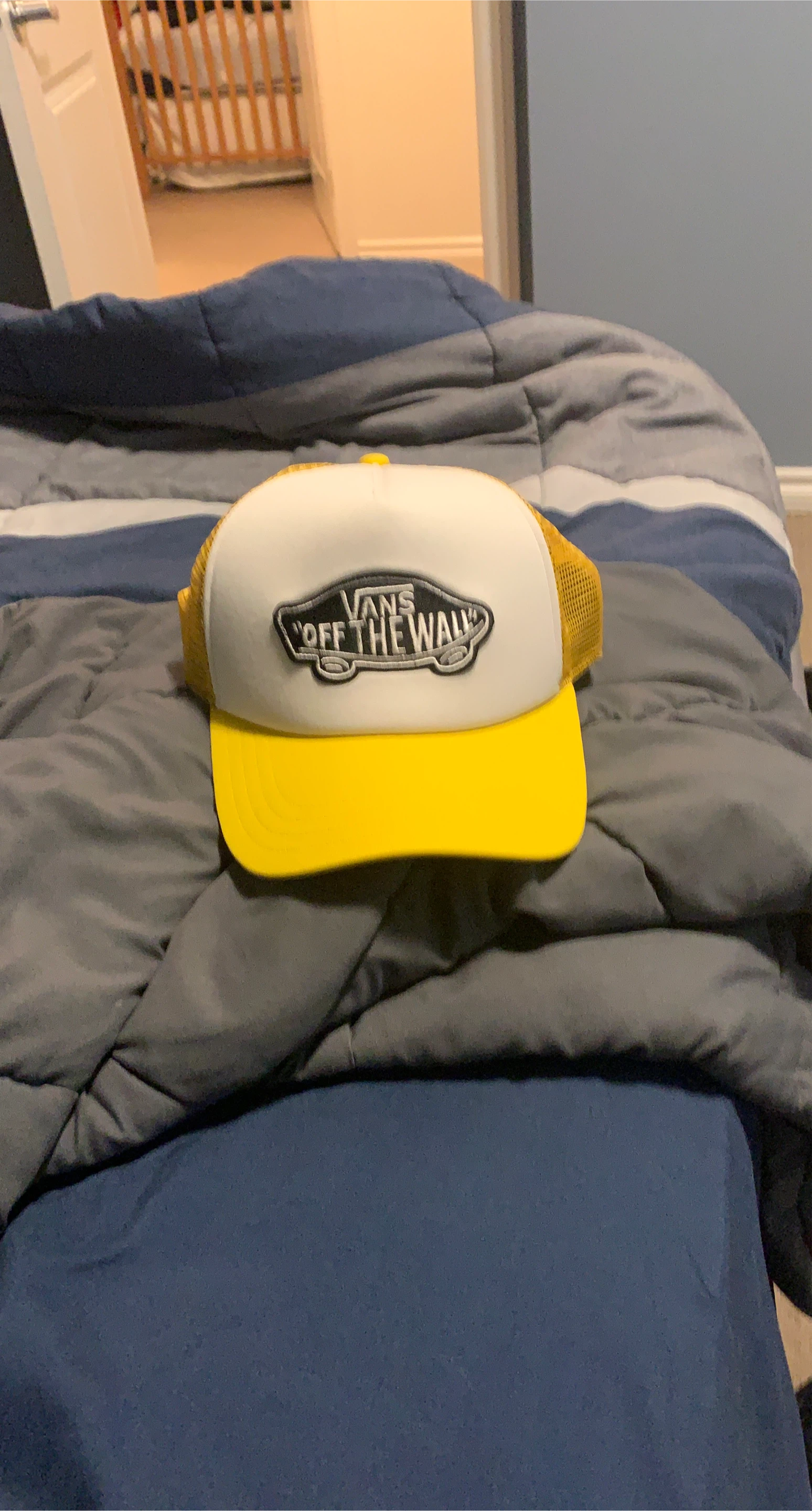 10Selling a Vans 'Off The Wall' trucker hat! It's in great condition and has a classic look with the yellow brim and white front panel. Perfect for adding a pop of colour to your outfit!