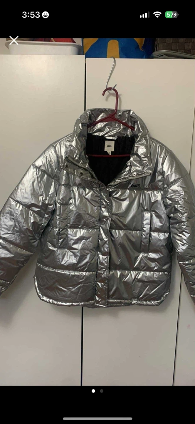 Selling a Vans puffer jacket in a shiny silver colour! It's a size medium and has a black interior. Perfect for staying warm and stylish during those chilly days!pick up cash only