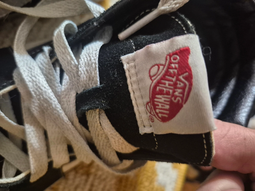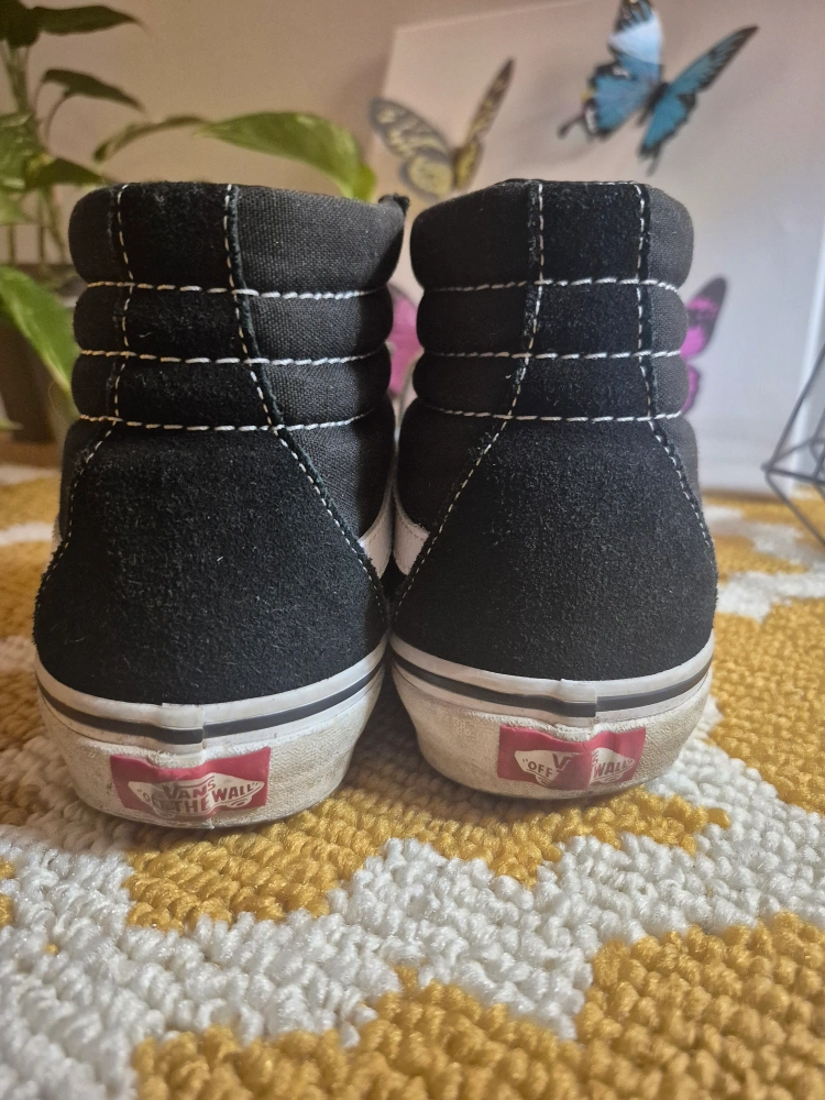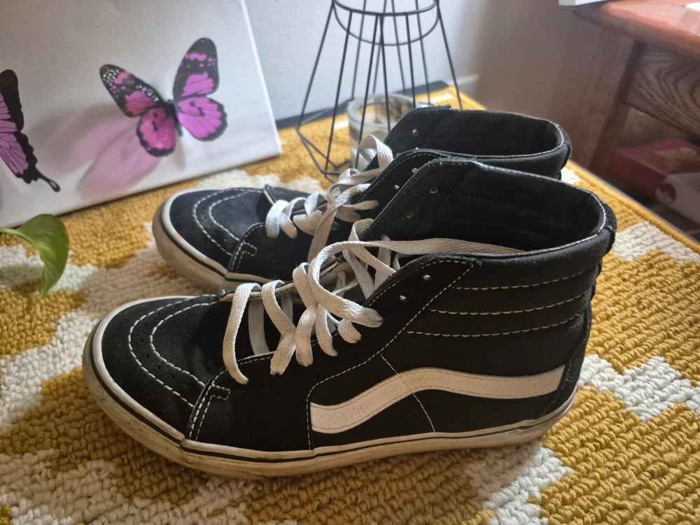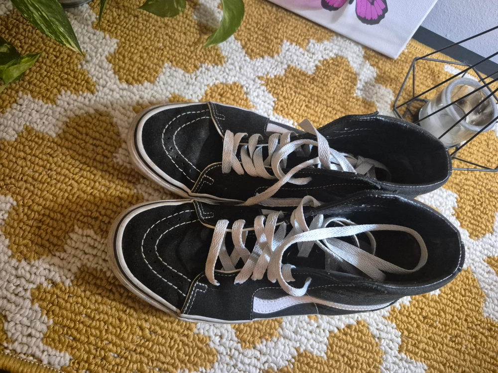 Black and white high top sneakers. White laces. Features a white stripe. The sole is white with a red logo. Would be great for a relaxed day out with friends.