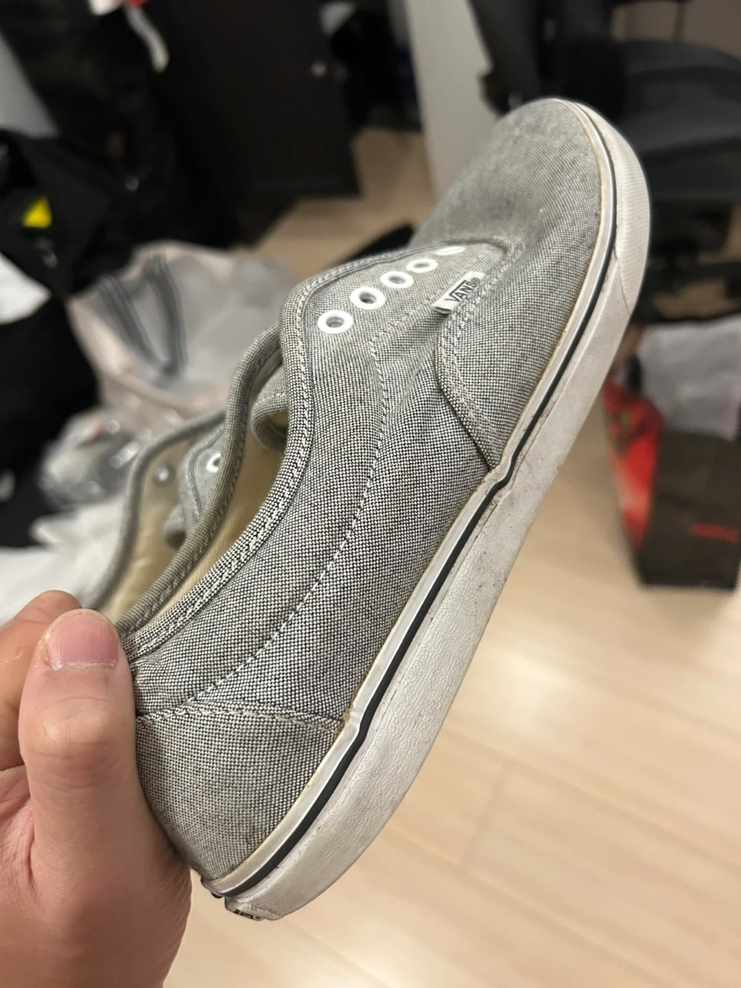 20Selling a pair of grey Vans slip-on shoes. They're in good condition and are a US size 8. Perfect for everyday wear!
