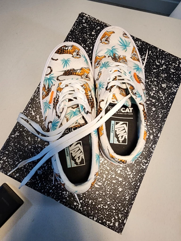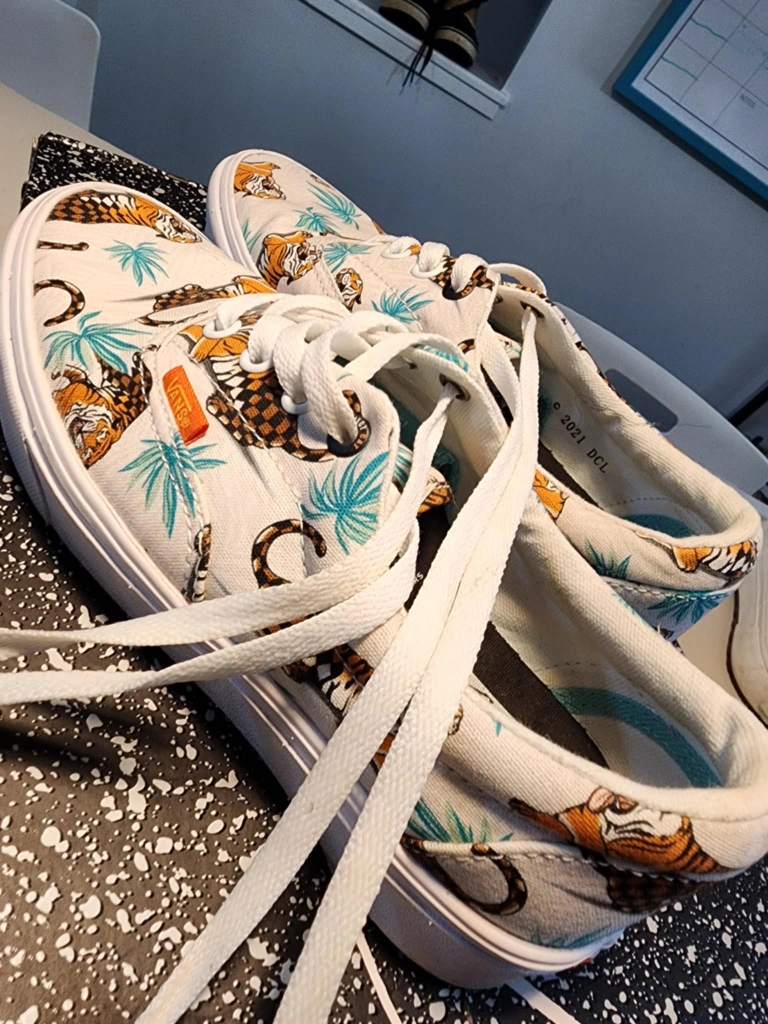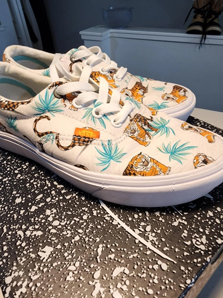 These sneakers feature a tiger print. White laces with a white sole. Perfect for a leisurely stroll.