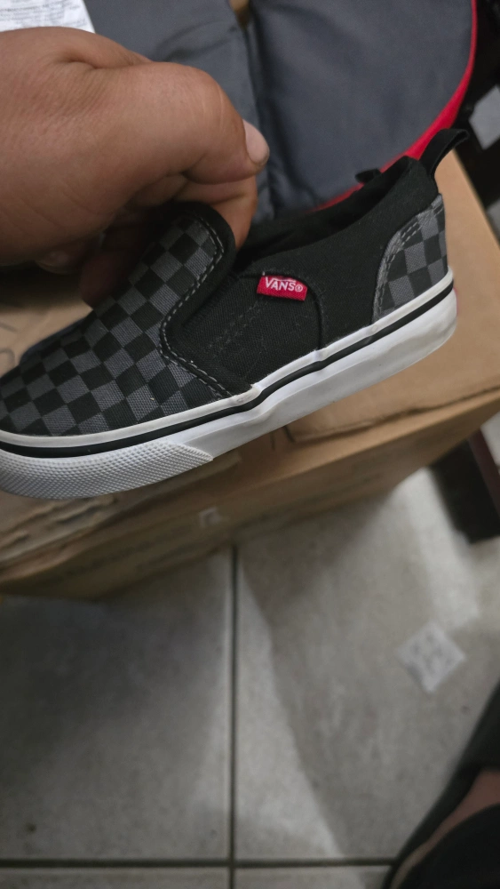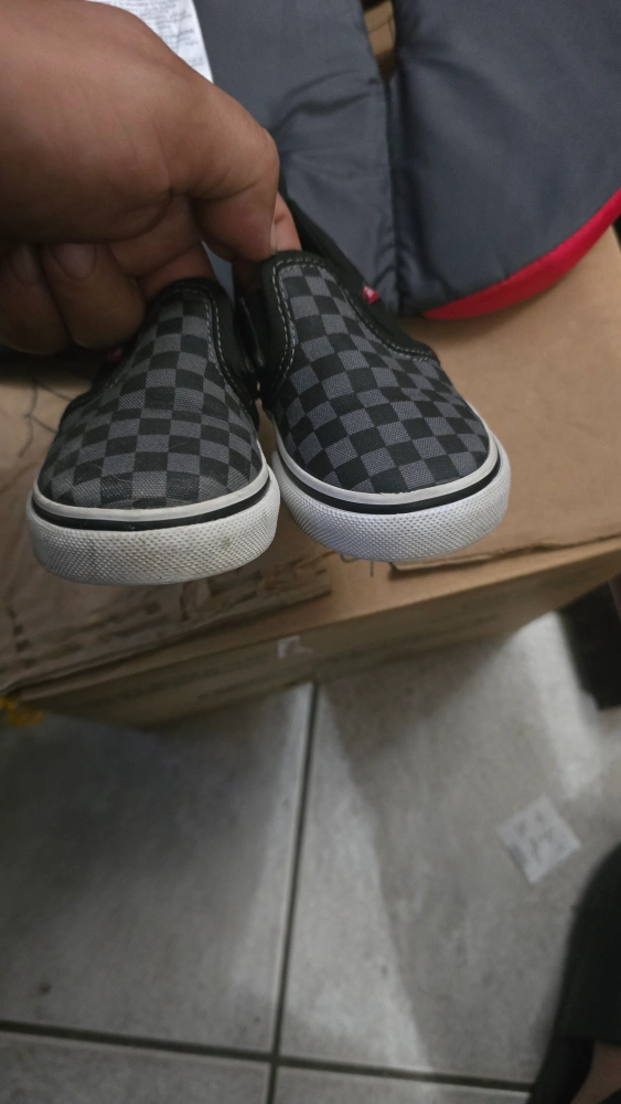 Selling a pair of Vans toddler slip-on shoes in size 8. They feature a black and grey checkerboard pattern. Perfect for your little one!