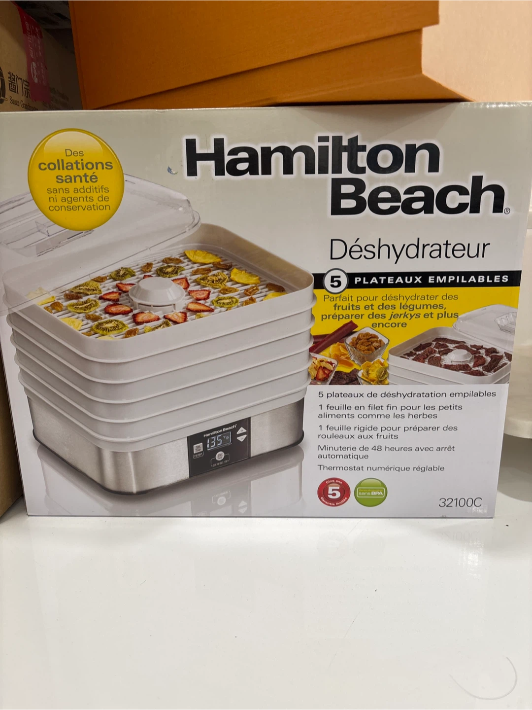This Hamilton Beach food dehydrator comes with 5 stackable trays. It includes a fine-mesh screen for herbs and a solid tray for fruit roll-ups. It has a digital thermostat and a 48-hour timer with auto shut-off. Perfect for making healthy snacks like dried fruits, vegetables, and jerky! Never been opened