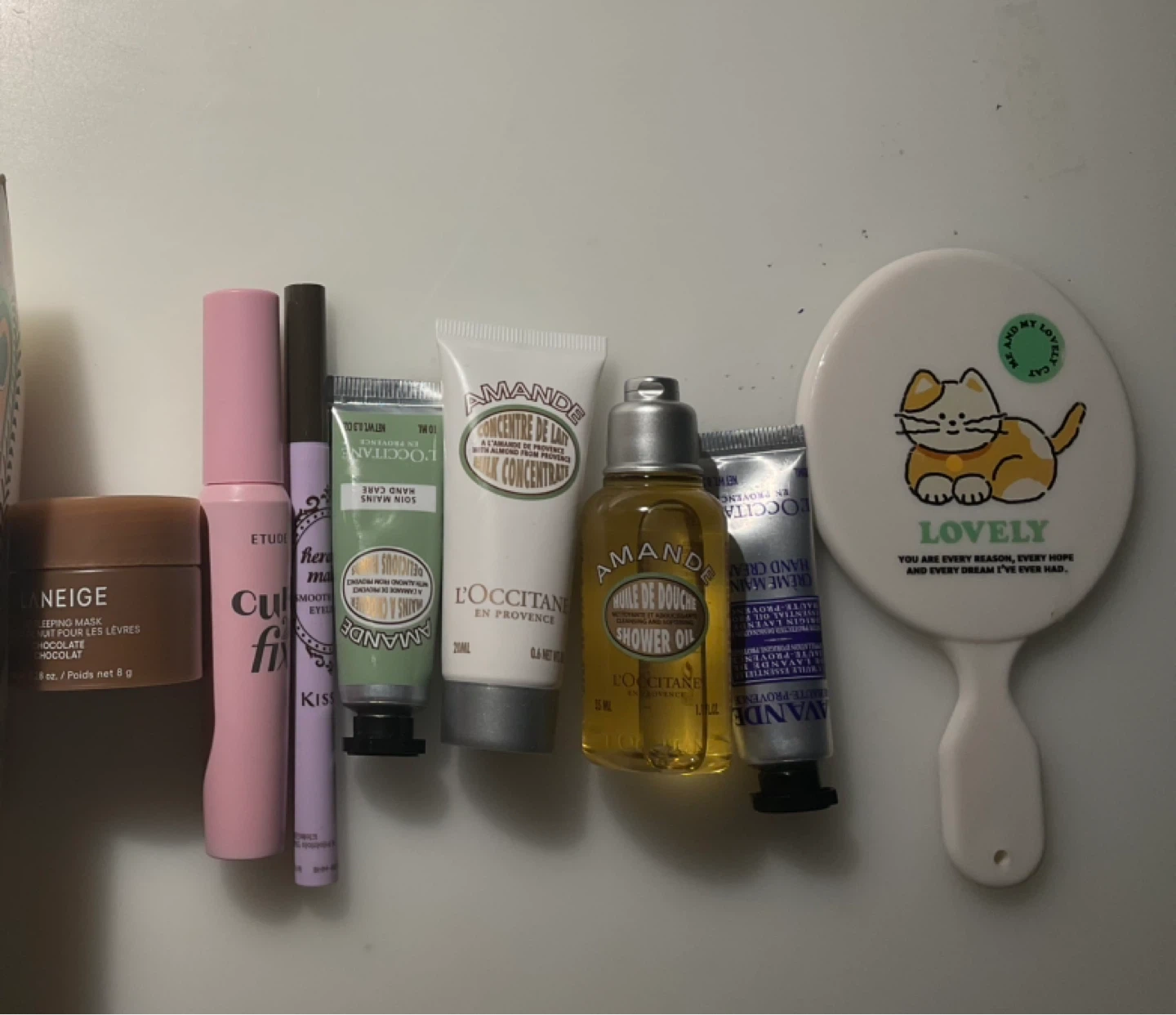 This set includes travel-sized L'Occitane Almond shower oil, milk concentrate, and hand cream, plus a Neige sleeping mask. It also comes with an Etude House mascara and kissme Eye Pencil and a cute mirror. Great for travel or trying out new products!