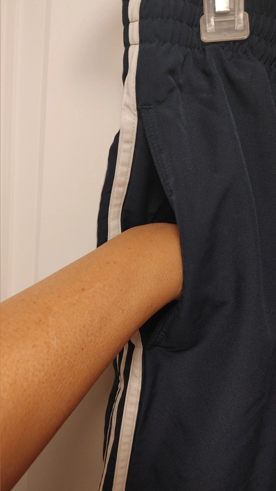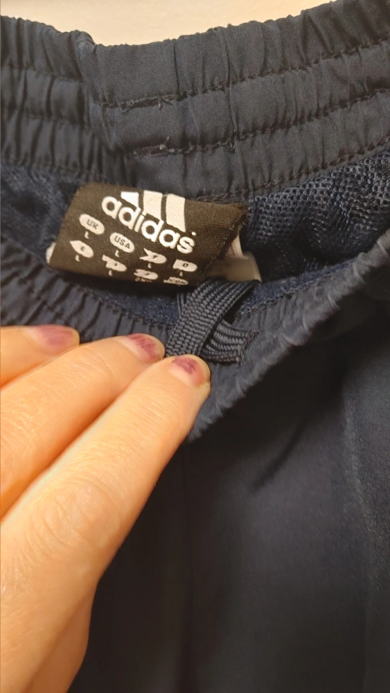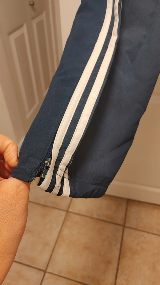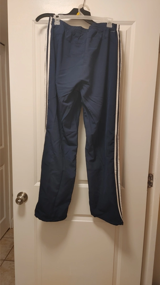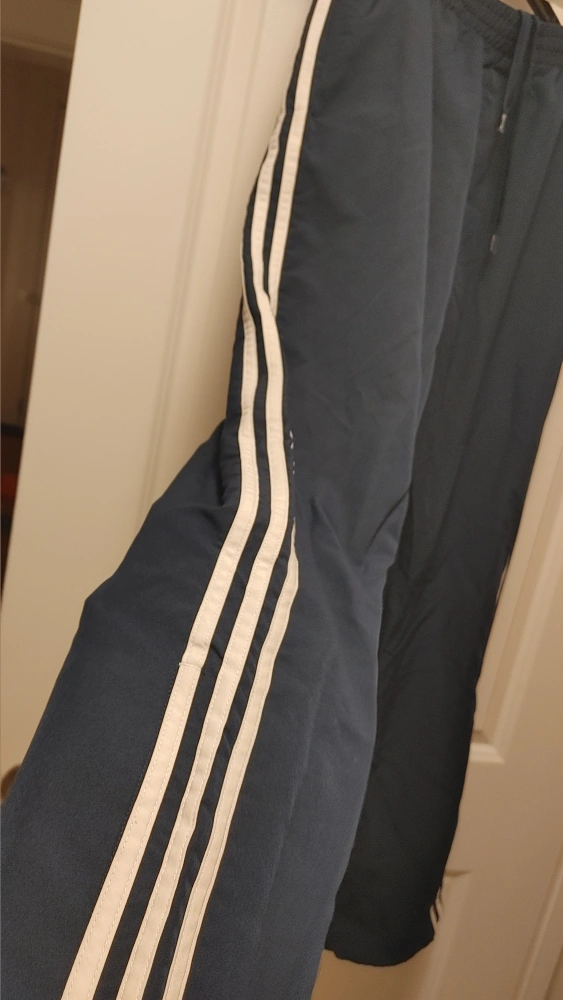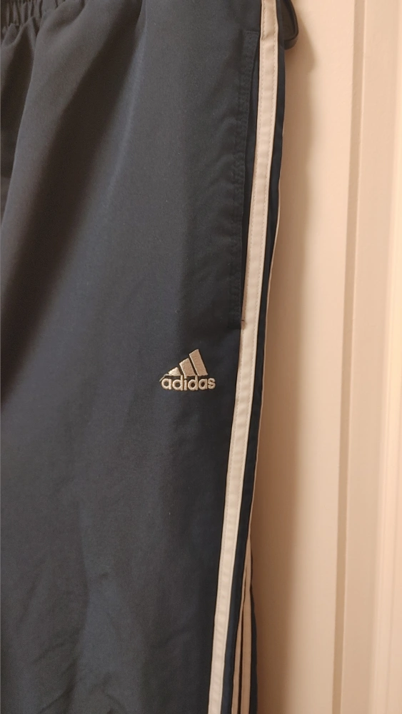 Navy blue Adidas track pants with white stripes down the sides. These pants have a drawstring waist and pockets. Size XL