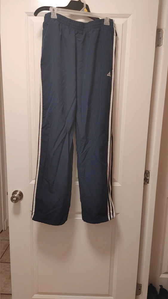 Navy blue Adidas track pants with white stripes down the sides. These pants have a drawstring waist and pockets. Size XL