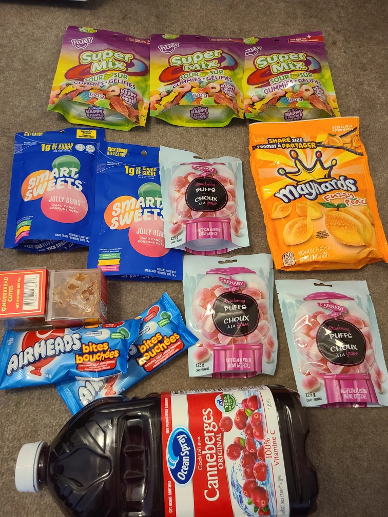 100Selling a mix of candies including Huer Super Mix, Smart Sweets Jolly Gems, Carnaby Strawberry Puffs, Maynards Fuzzy Peach, Airheads Bites, and Gingerbread Cuties. Also includes Ocean Spray Cranberry Cocktail. Perfect for sharing!