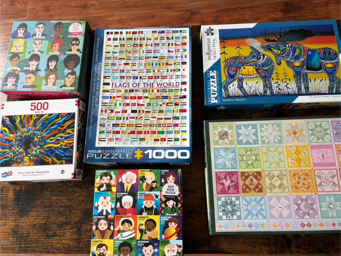 76Selling a collection of fun puzzles! There's a Eurographics Flags of the World 1000-piece puzzle, a Mudpuppy 500-piece puzzle, and a few others with unique designs like 'History of Hairdos' and an Indigenous Collection puzzle. Great for puzzle enthusiasts!