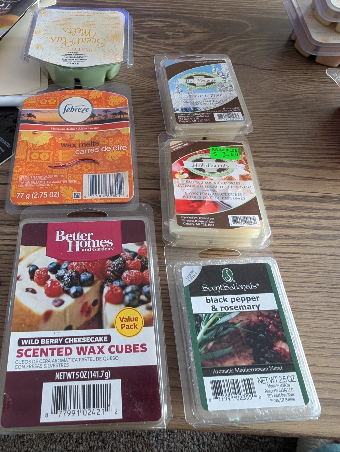 226Selling a variety of scented wax melts including brands like Febreze, Better Homes and Gardens, Ambi Scents, and Scentsationals. Different scents available such as Wild Berry Cheesecake, Black Pepper & Rosemary, Santa's Sugar Cookies, and Hawaiian Aloha. Perfect for freshening up your home! The first picture is wax melts are missing at least 1 piece.