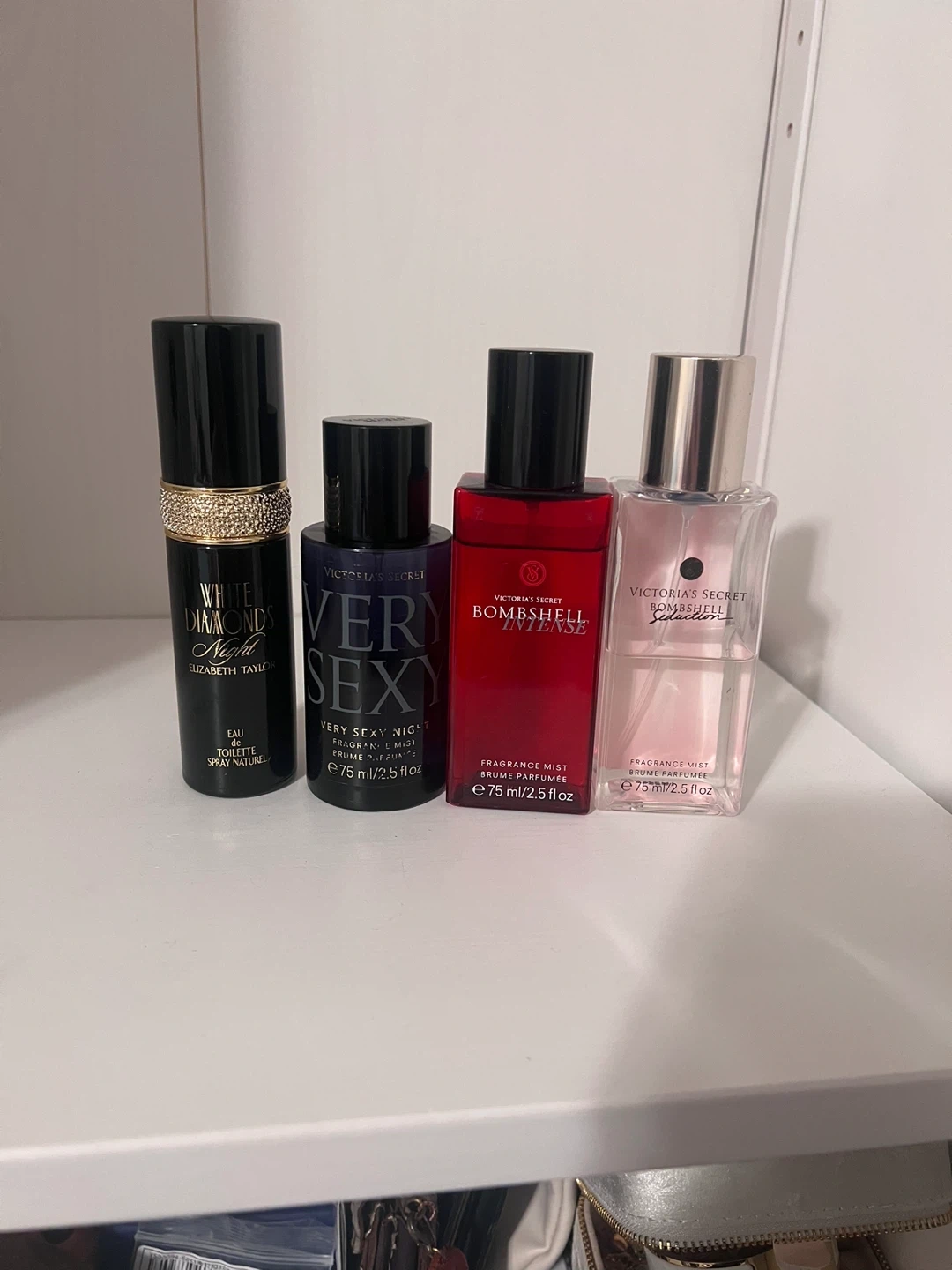 Selling a set of perfume and fragrance mists! Includes Elizabeth Taylor White Diamonds Night Eau de Toilette (more than half left)and three Victoria's Secret fragrance mists: Very Sexy Night(half left) , Bombshell Intense(more than half left), and Bombshell Seduction(half left)