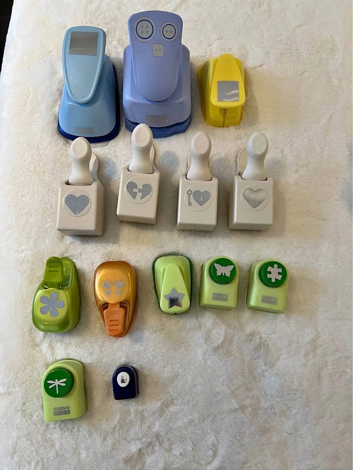 10Various shapes and sizes craft punches. The following punches are sold: both square punches, button punch, dragonfly and green butterfly punch. Feel free to message if you have any questions!
