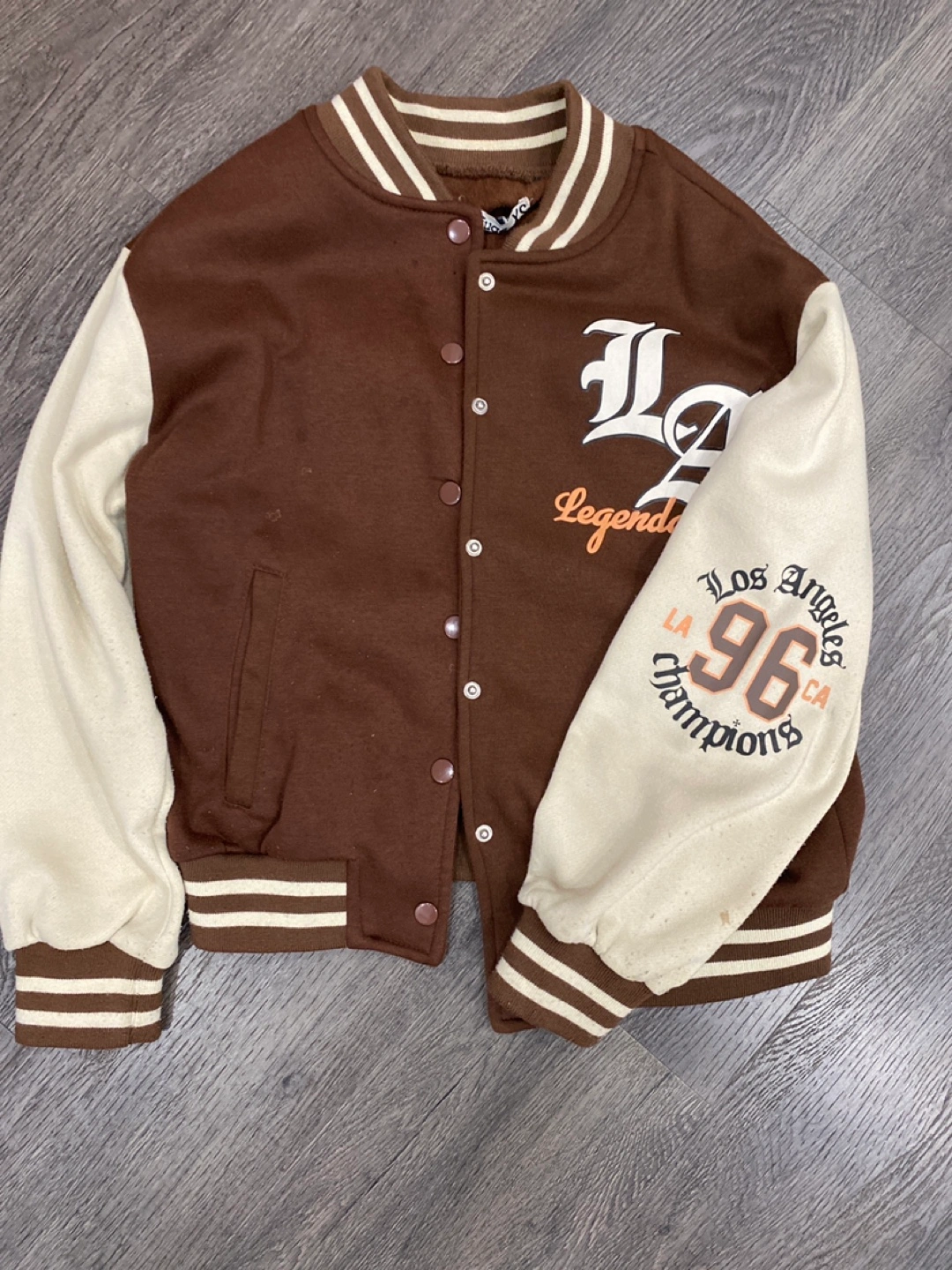 Brown varsity jacket. Off-white sleeves. Features the words "Los Angeles", "Legend", and "Champions". A great jacket to wear when the weather gets cooler, providing a sense of warmth and comfort.