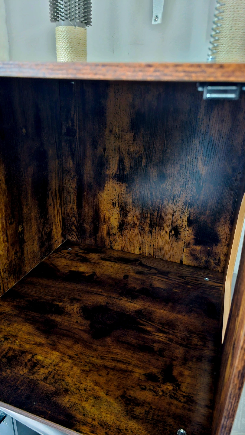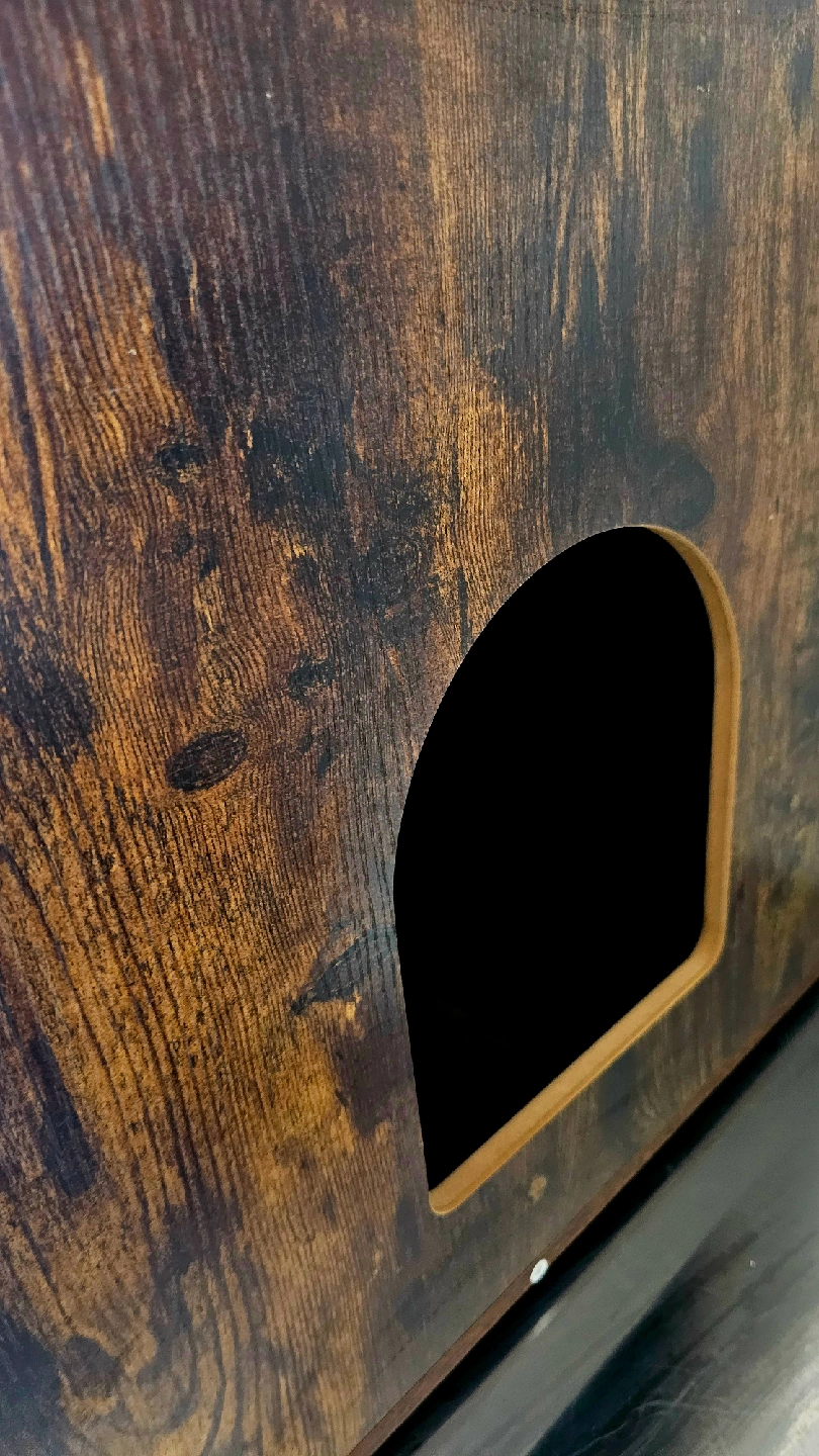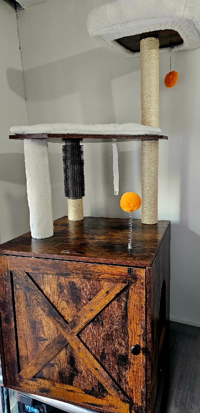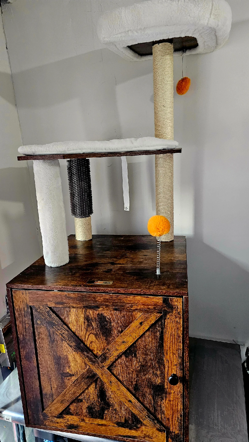 Looking to spoil your feline friend? This VASAGLE cat tree cabinet is the perfect addition to any home! It features a cozy cabinet space, scratching posts, and a fun dangling ball to keep your cat entertained for hours. The dark brown wood finish adds a touch of rustic charm to your decor, and it's in great condition!