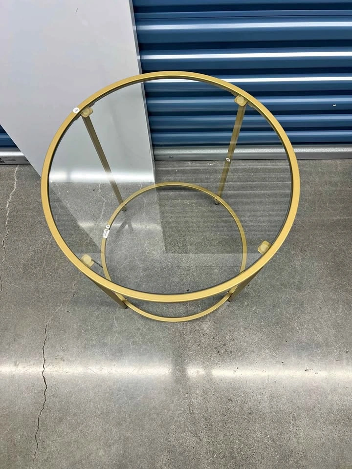49Modern round side table with a tempered glass top and a sleek gold metal frame. Perfect as a living room accent, bedside table, or coffee corner piece. Sturdy and elegant — supports up to 88 lbs. Brand new, pulled from a liquidation pallet. Dimensions: 19.7" (diameter) × 21.6" (height)