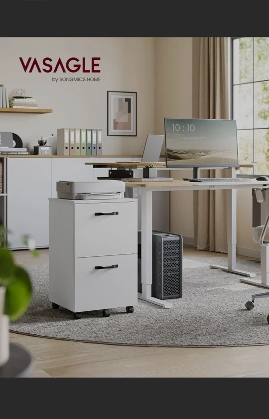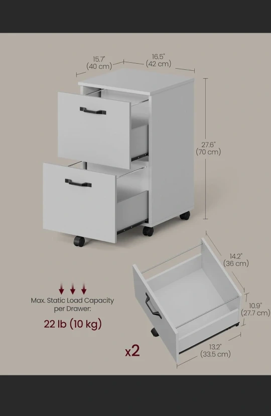 10Looking to keep your office organized? This VASAGLE file cabinet is perfect! It comes with two drawers to keep your documents tidy. Key features: - Dimensions: 16.5" (42 cm) wide, 15.7" (40 cm) deep, and 27.6" (70 cm) high - Each drawer has a max static load capacity of 22 lb (10 kg) - Comes in its original box