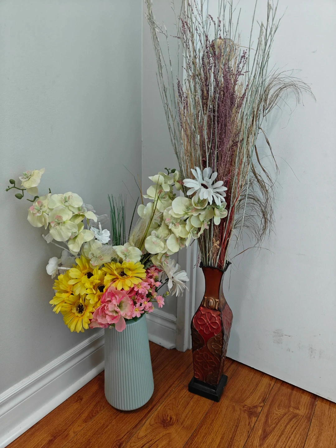 20Two vases with artificial flower arrangements. One is a light blue vase with a mix of yellow, pink, and white flowers. The other is a tall brown vase with dried branches and white flowers. Perfect for adding a touch of colour to any room!