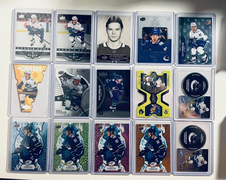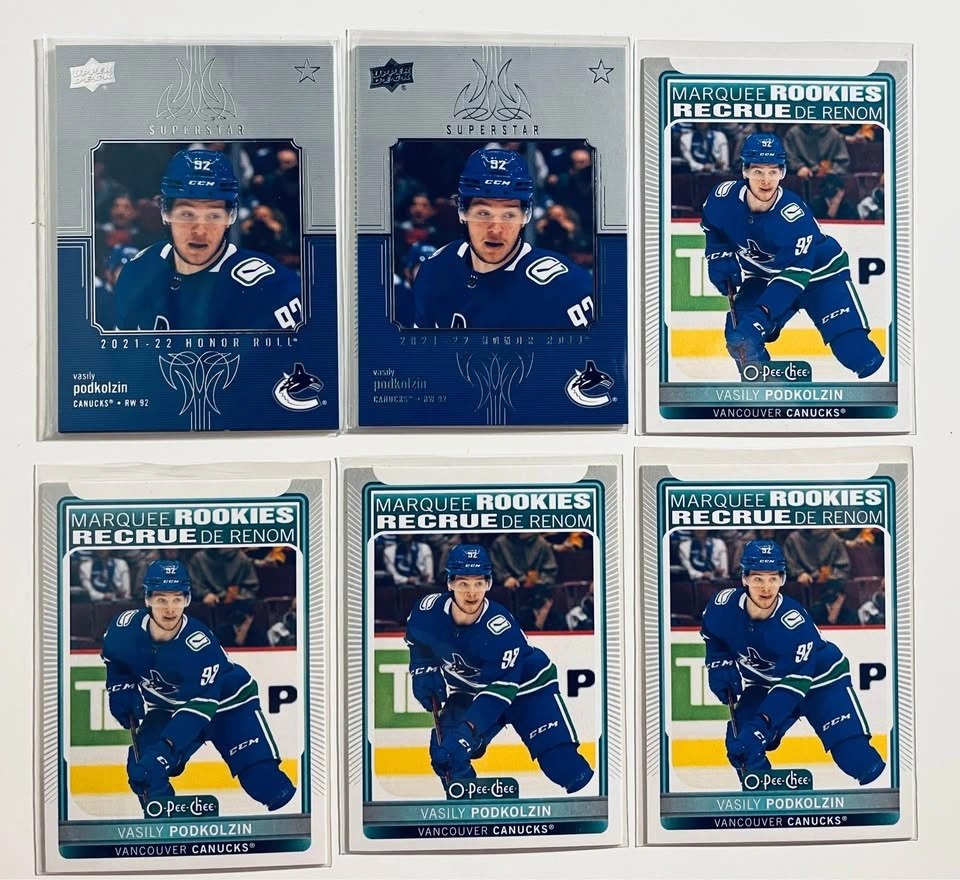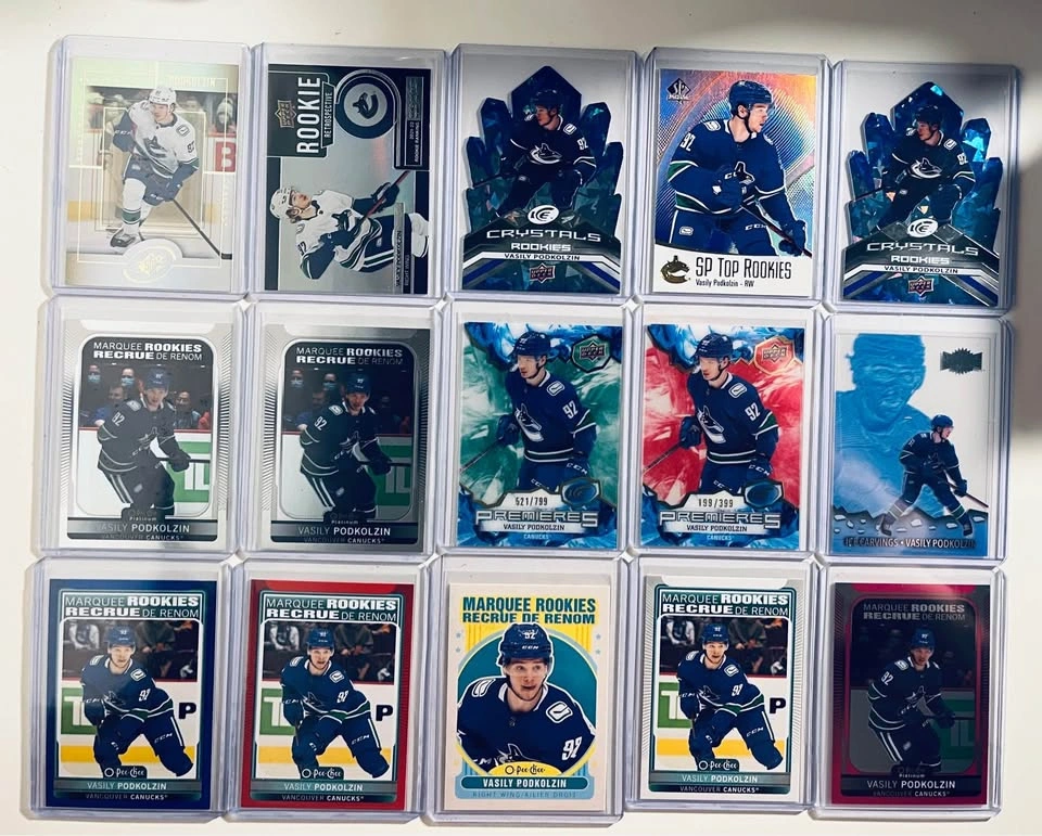 For Sale: Vasily Podkolzin Rookie Card Lot, 47 cards. Former Vancouver Canucks, current Oilers. Including Young Guns, French YG, Marquee Rookies, Acetate cards, numbered cards. See list: * 2021–22 Upper Deck Series 2, Young Guns x 5 * 2021–22 Upper Deck Extended Series Young Guns Retro x 3 * 2021–22 Upper Deck Extended Series Young Guns Canvas * 2021-22 Upper Deck Series 2 Jeunes Loups/ French Young Guns * 2021–22 Upper Deck Exquisite Collection Rookies 127/299 * 2021–22 Upper Deck Extended Series HOLOGRFX Silver * 2021–22 Upper Deck Series 2 Superstar Honor Roll x 3 * 2021–22 Upper Deck Series 2 UD Portraits * 2021–22 Upper Deck Extended Series Black Diamond Rookie Gems x 2 * 2021–22 NHL Metal Universe RC Base * 2021–22 Upper Deck Allure Rookie * 2021–22 NHL Metal Universe, The Cheddar * 2021–22 Upper Deck Extended Series Future Impact Rookie 0373/1000 * 2021–22 UD Ice Hockey Shrines Rookie Acetate x 2 * 2021–22 UD Ice Hockey, Rookie Orange * 2021–22 UD Ice Hockey, Rookie Purple * 2021–22 UD Ice Hockey, Rookie Blue * 2021–22 UD Ice Hockey, Rookie Green * 2021–22 UD Ice Hockey Ice Crystals Rookies x 2 * 2022–23 Upper Deck Series 1 Rookie Retrospective * 2021–22 Upper Deck Extended Series SPX NHL Rookie * 2021–22 SP Authentic Hockey SP Top Rookies * 2021–22 NHL Metal Universe Ice Carvings * 2021–22 UD Ice Hockey Red 199/399 * 2021–22 UD Ice Hockey Green 521/799 * 2021–22 O-Pee-Chee Marquee Rookies x 5 * 2021–22 O-Pee-Chee Platinum Marquee Rookies x 2 * 2021–22 O-Pee-Chee Platinum Marquee Rookies Matte Pink * 2021–22 O-Pee-Chee Marquee Rookies Blue * 2021–22 O-Pee-Chee Marquee Rookies Red * 2021–22 O-Pee-Chee Retro Marquee Rookies $60 for the entire lot. Cards are in NRMT, Good / Fair condition. Pickup only in Vancouver Downtown. Cash or E-transfer payment accepted. No trades. Feel free to message me with any questions!