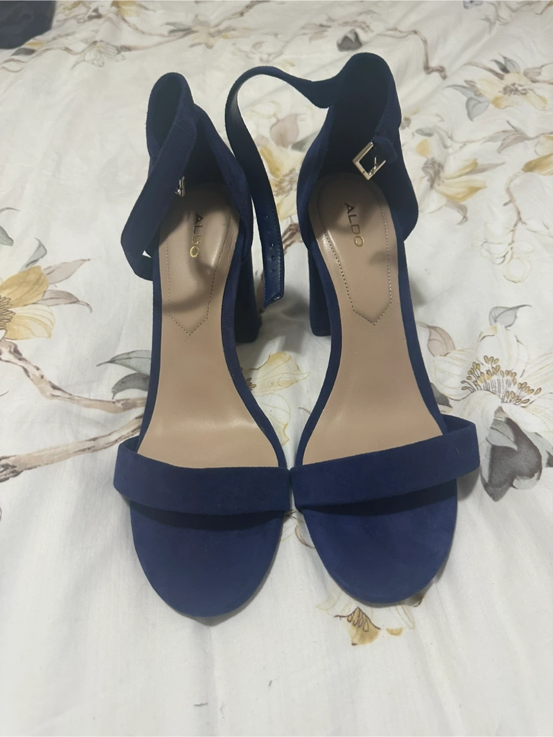 These navy blue suede sandals from ALDO feature a stylish block heel and ankle strap closure. Worn once.