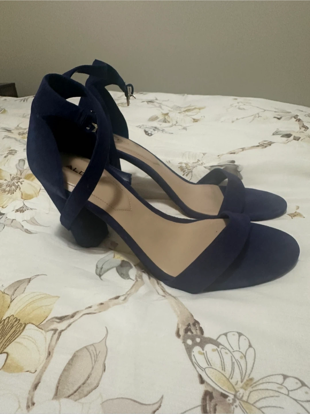 These navy blue suede sandals from ALDO feature a stylish block heel and ankle strap closure. Worn once.