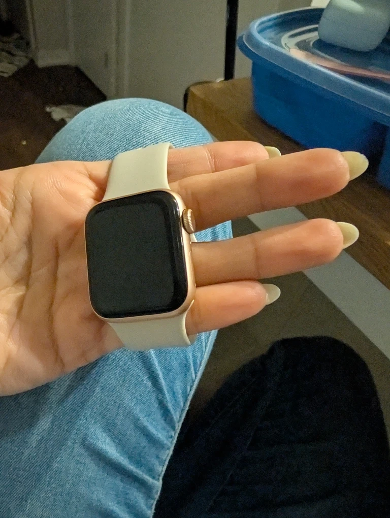 Selling an Apple Watch with a beige band. It's in good condition and ready for a new owner! Perfect for tracking your fitness or staying connected on the go