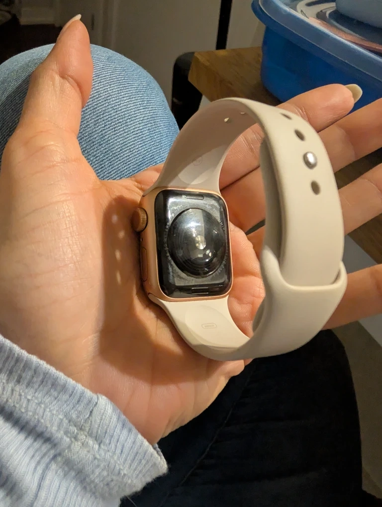 Selling an Apple Watch with a beige band. It's in good condition and ready for a new owner! Perfect for tracking your fitness or staying connected on the go