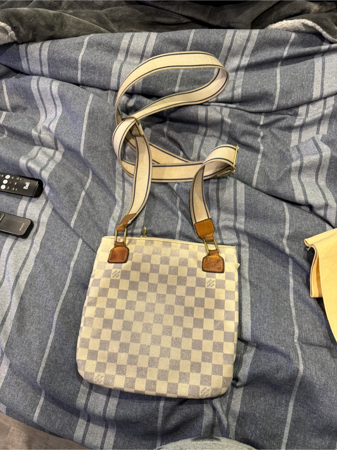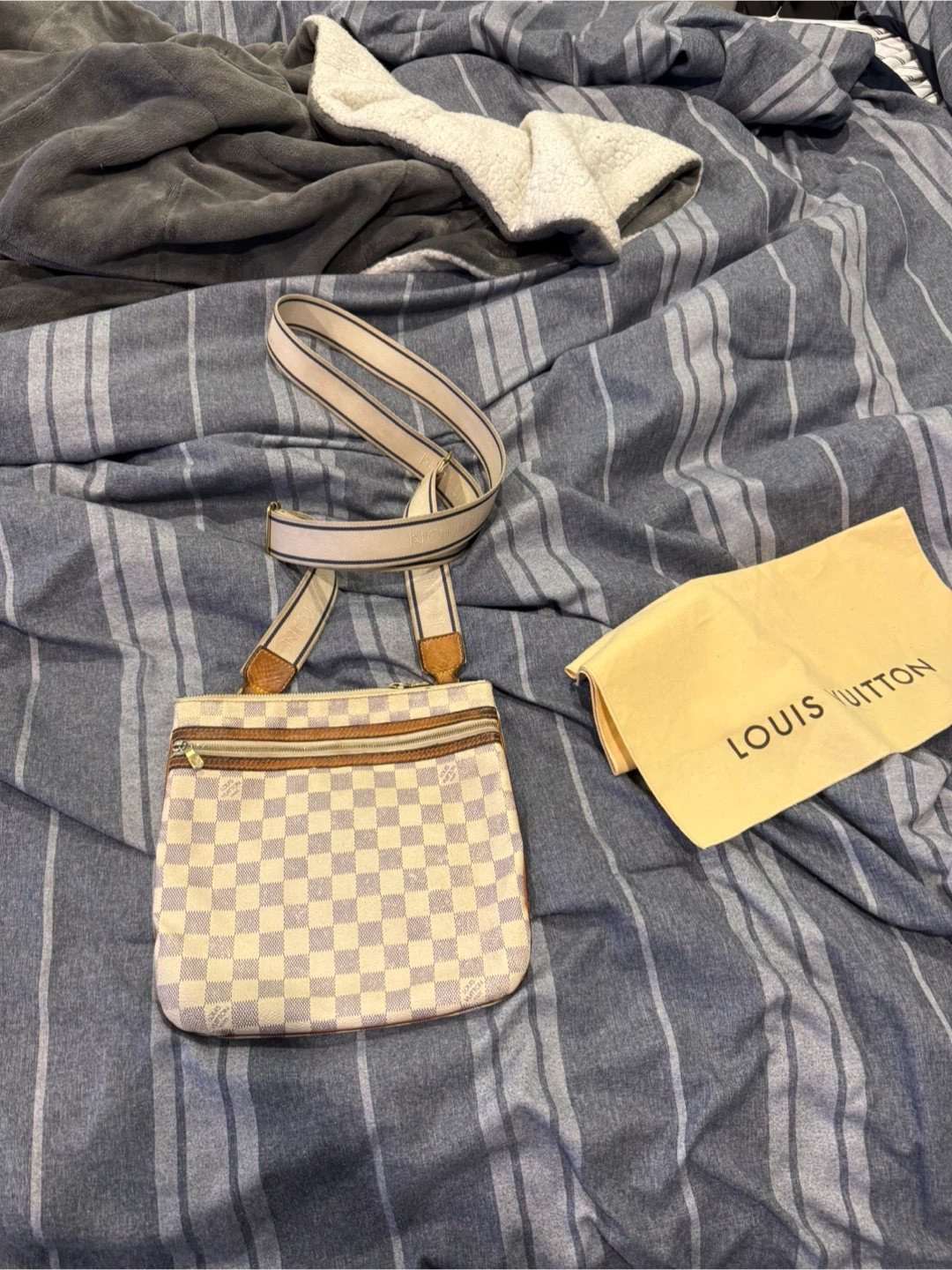 Authentic Louis Vuitton crossbody bag in Damier Azur canvas. It features a zip-top closure and an adjustable strap. Comes with its original dust bag. This bag is great for everyday use! Older but authentic take it for $200