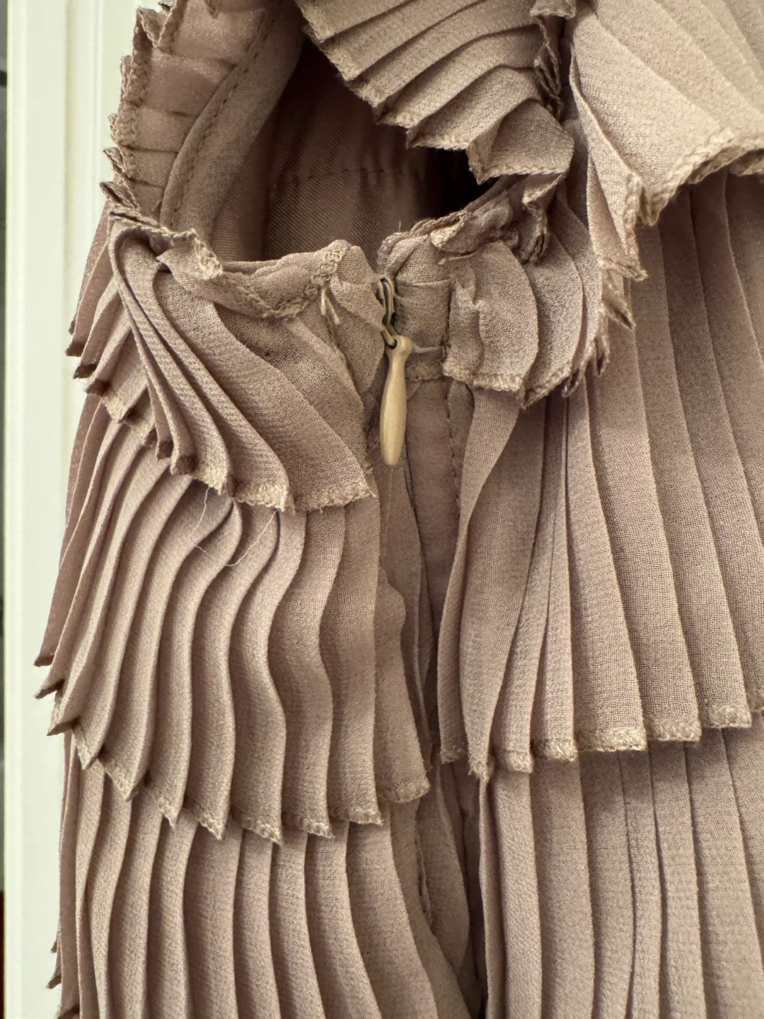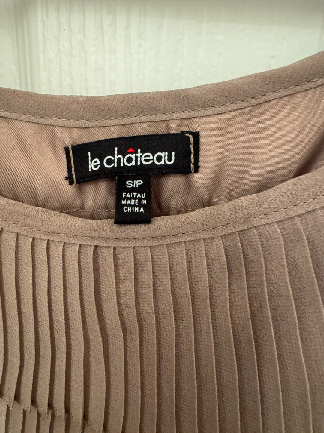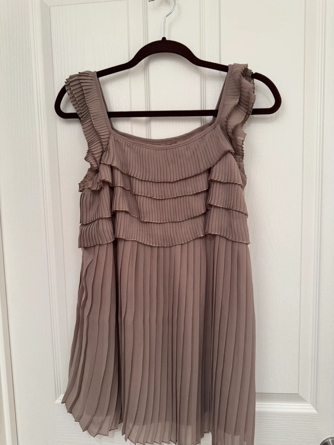 This is a taupe-coloured sleeveless top from Le Château. It's made with a lightweight, pleated fabric and features tiered ruffles along the neckline and bodice. The side has a zipper closure. A lovely piece for dressing up!