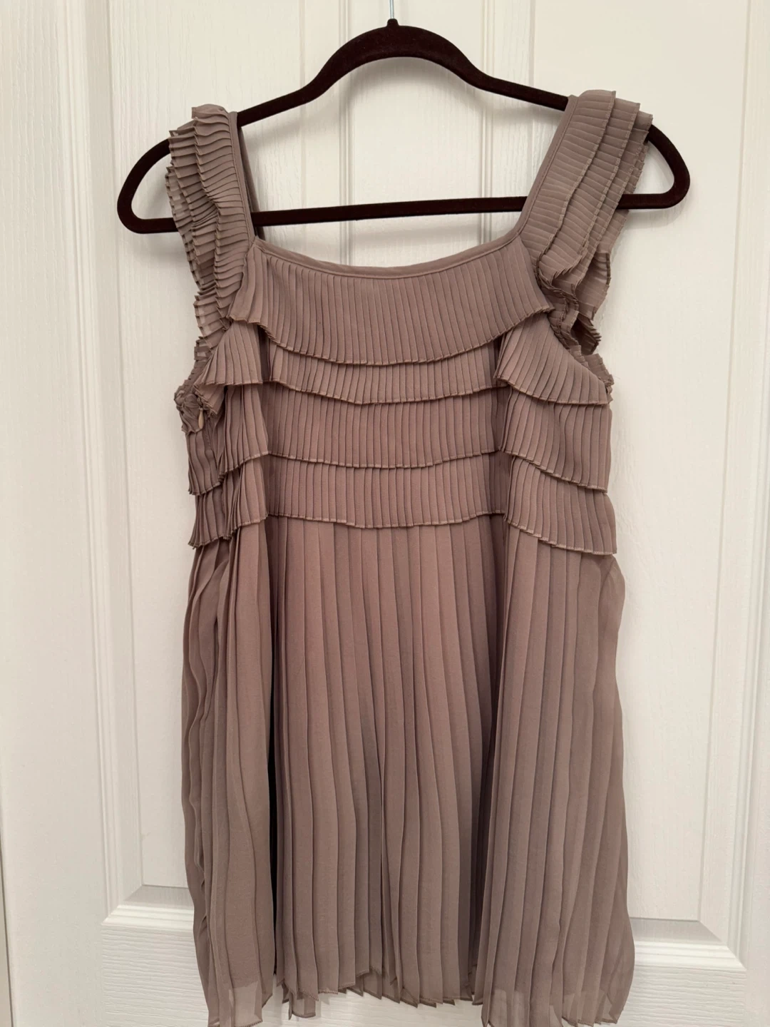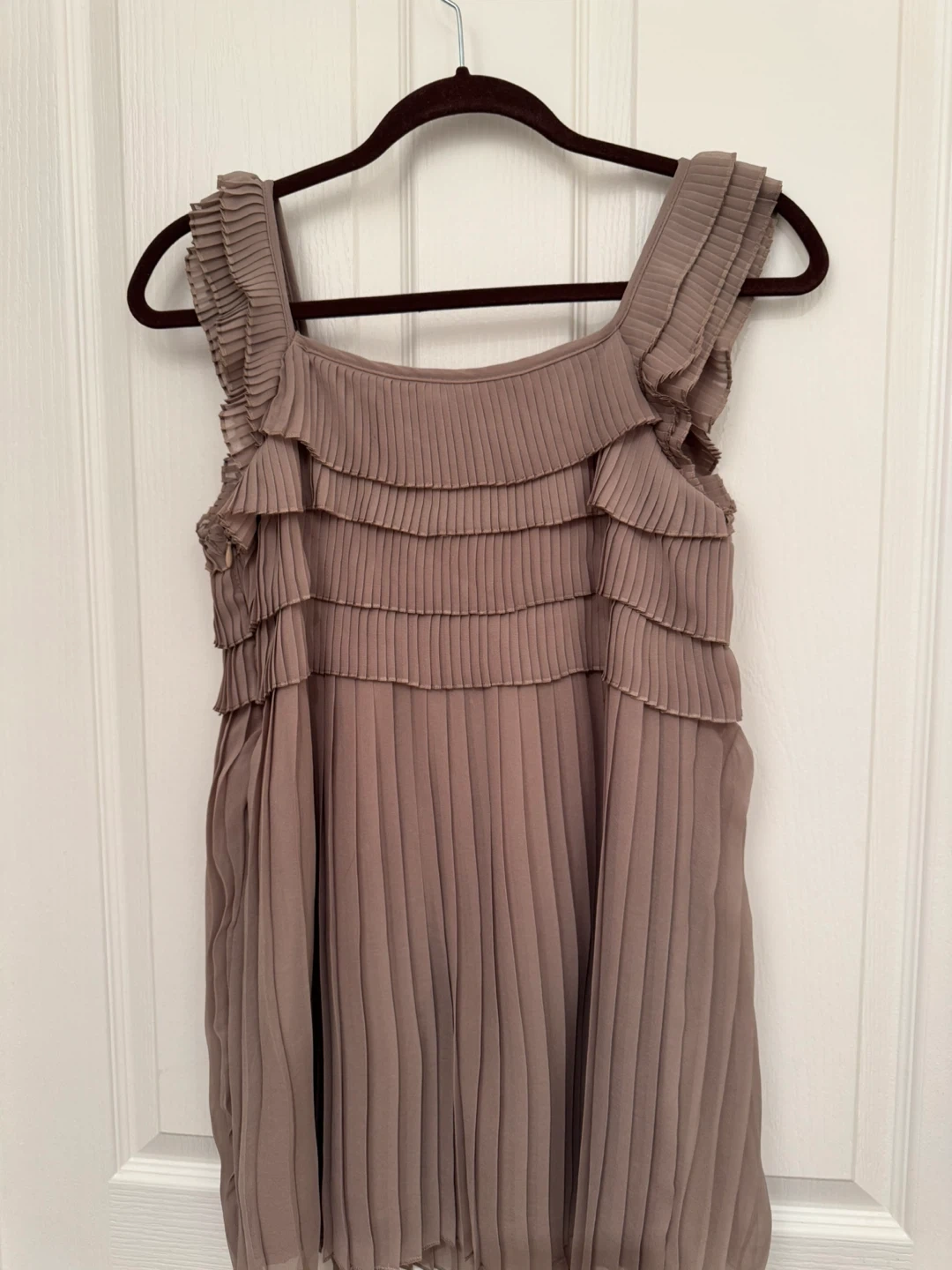 This is a taupe-coloured sleeveless top from Le Château. It's made with a lightweight, pleated fabric and features tiered ruffles along the neckline and bodice. The side has a zipper closure. A lovely piece for dressing up!