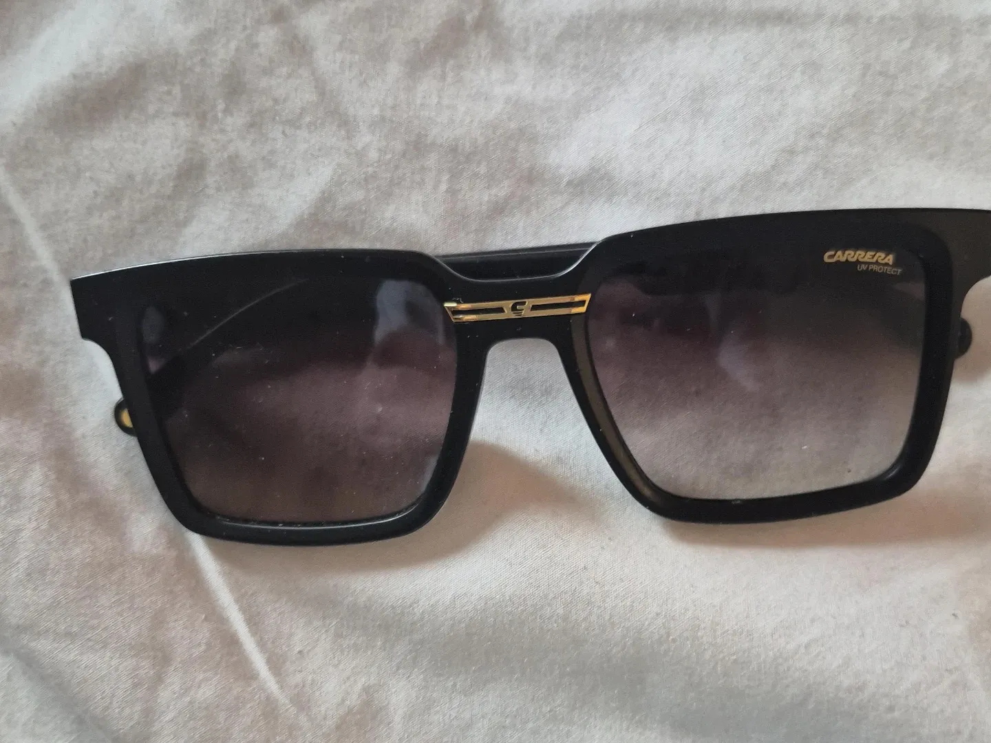 These are Carrera sunglasses with UV protection. They're black and have a classic square frame design. Perfect for shielding your eyes from the sun!