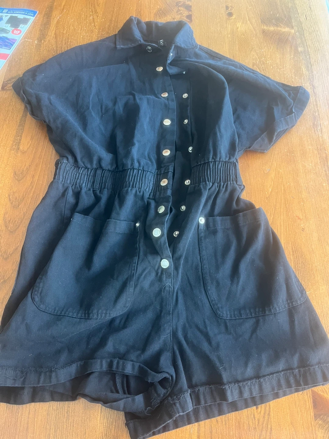 15Selling a cute black romper from VATTI! It's a size small and in good condition. Perfect for a casual day out or dressing up for an evening. It features an elastic waistband and button down front