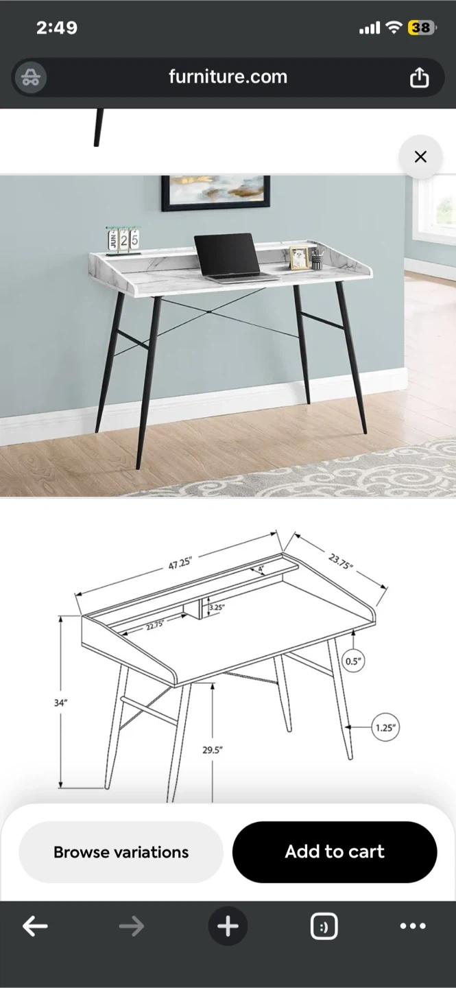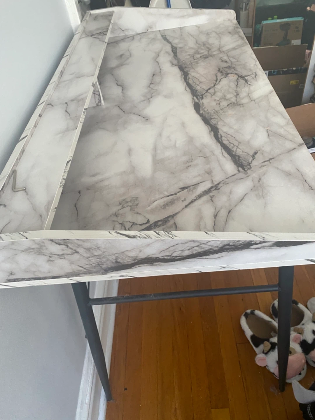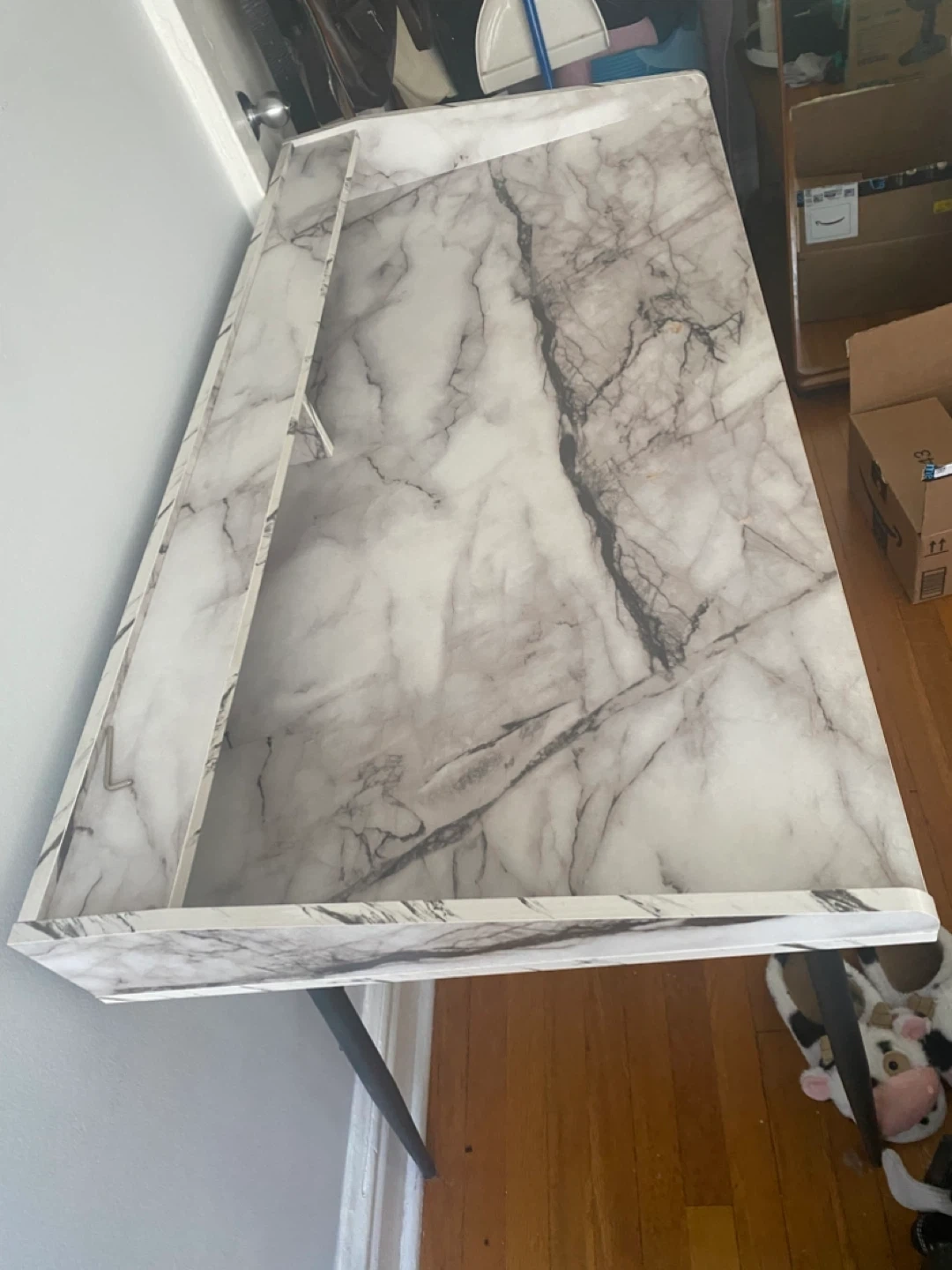 Serious buyers only plis I’m tired y’all 🙄 This desk features a stylish marble print finish on the surface and a convenient shelf for storage. Its metal legs provide sturdy support. Has been with me for a while so the paint has lifted in 2 spots as shown in the pictures but you can barely tell. It's a great addition to any home office or study area! Available for IMMEDIATE pick up most evenings~
