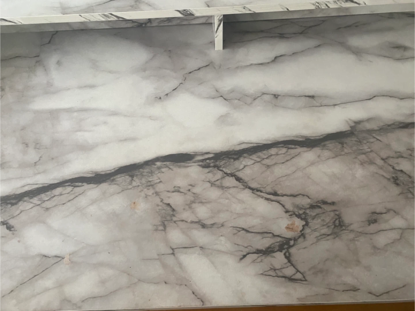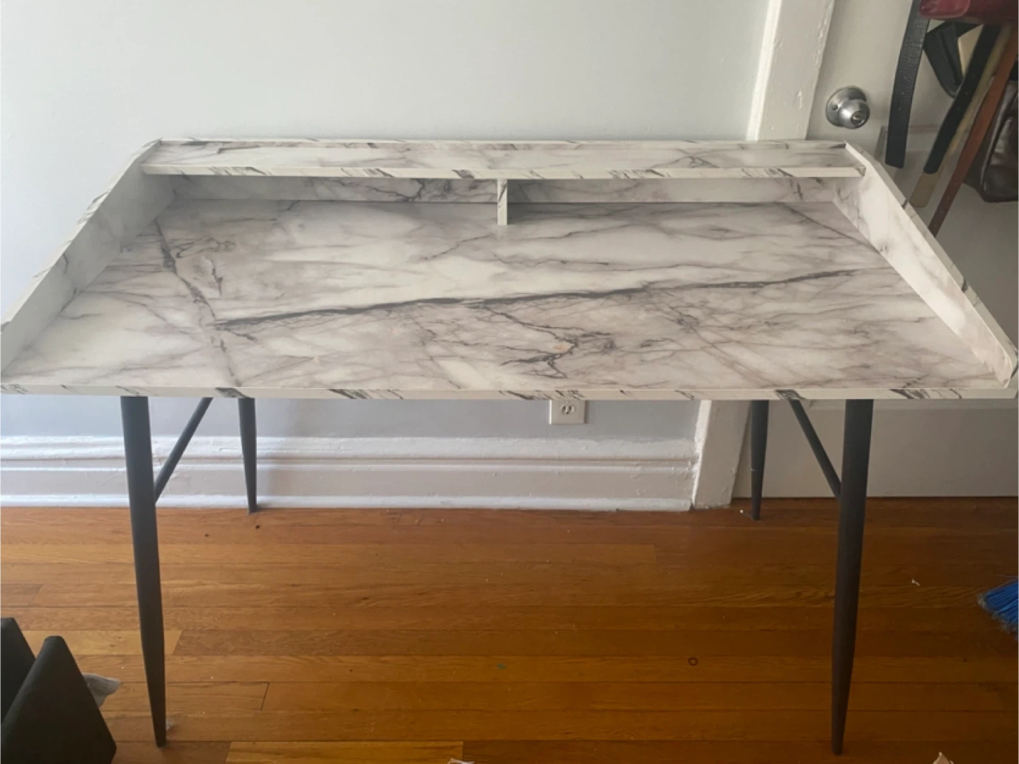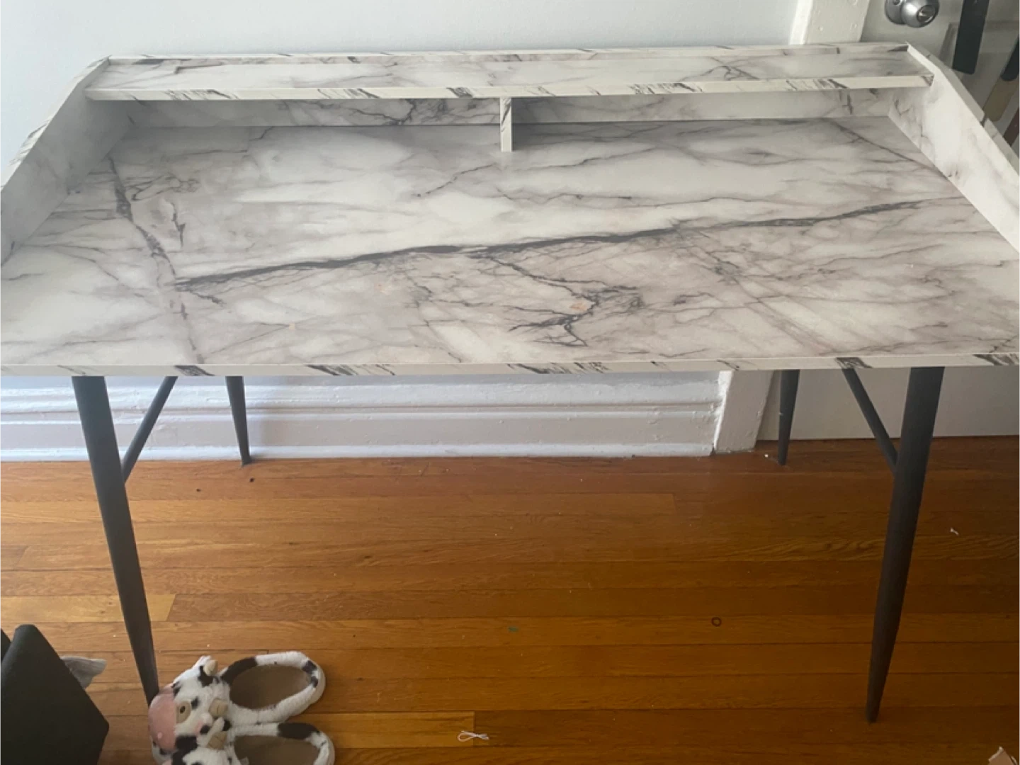 Serious buyers only plis I’m tired y’all 🙄 This desk features a stylish marble print finish on the surface and a convenient shelf for storage. Its metal legs provide sturdy support. Has been with me for a while so the paint has lifted in 2 spots as shown in the pictures but you can barely tell. It's a great addition to any home office or study area! Available for IMMEDIATE pick up most evenings~