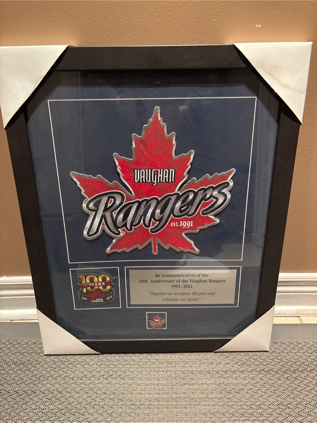 Framed art commemorating the 20th Anniversary of the Vaughan Rangers (1991-2011). Features the Vaughan Rangers logo with a maple leaf design and includes text celebrating their history