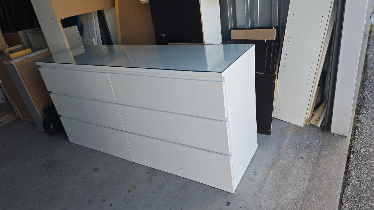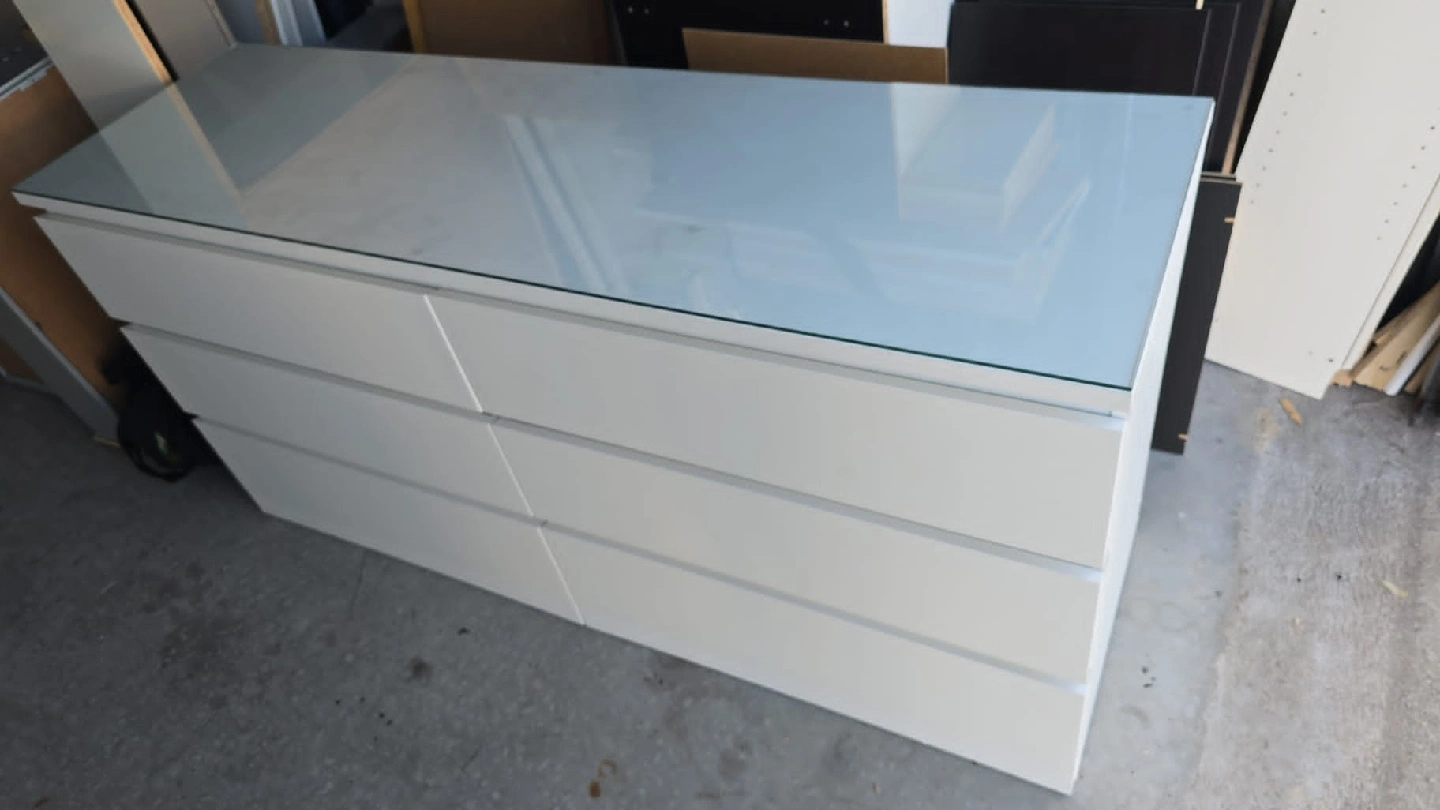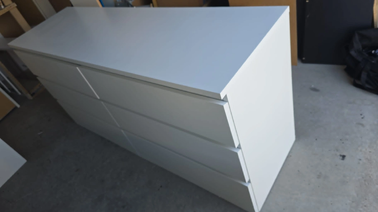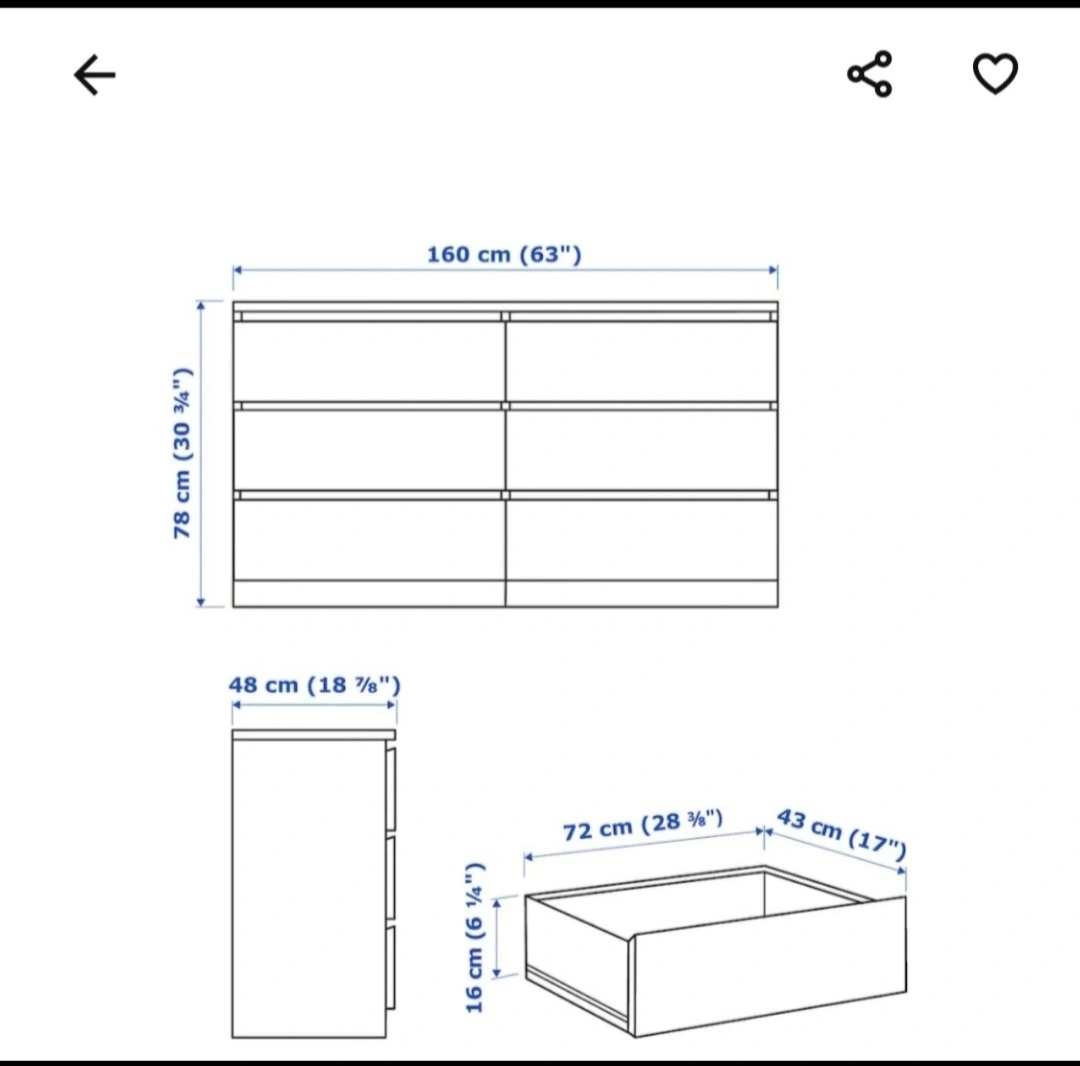 Selling a white IKEA Malm dresser with 6 drawers! It's in great shape and ready for a new home. The dimensions are approximately 160 cm (63") wide, 78 cm (30 3/4") tall, and 48 cm (18 7/8") deep. Perfect for adding lots of storage space to any room