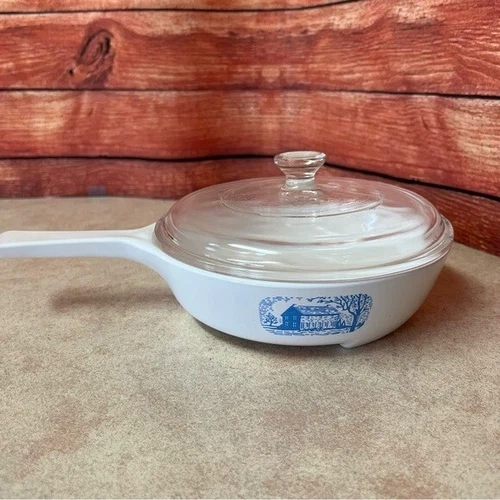 Approx 7" skillet in excellent condition with no chips, cracks, or stains. Features the Blue Colonial House pattern. Comes with a lid. The lid has a tiny chip on the outside edge, which is not sharp (see last two pictures).