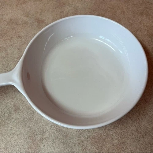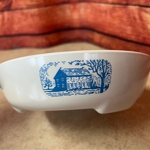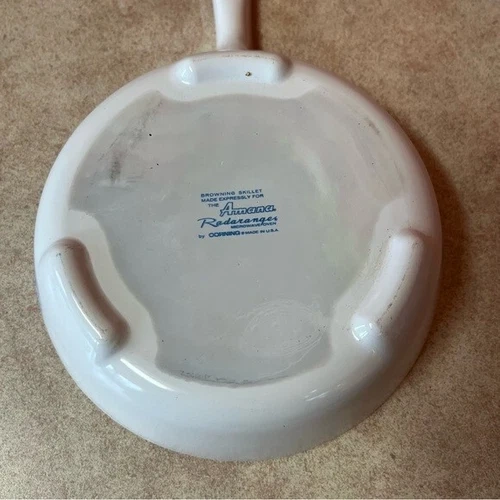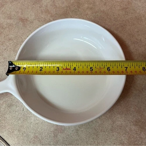Approx 7" skillet in excellent condition with no chips, cracks, or stains. Features the Blue Colonial House pattern. Comes with a lid. The lid has a tiny chip on the outside edge, which is not sharp (see last two pictures).