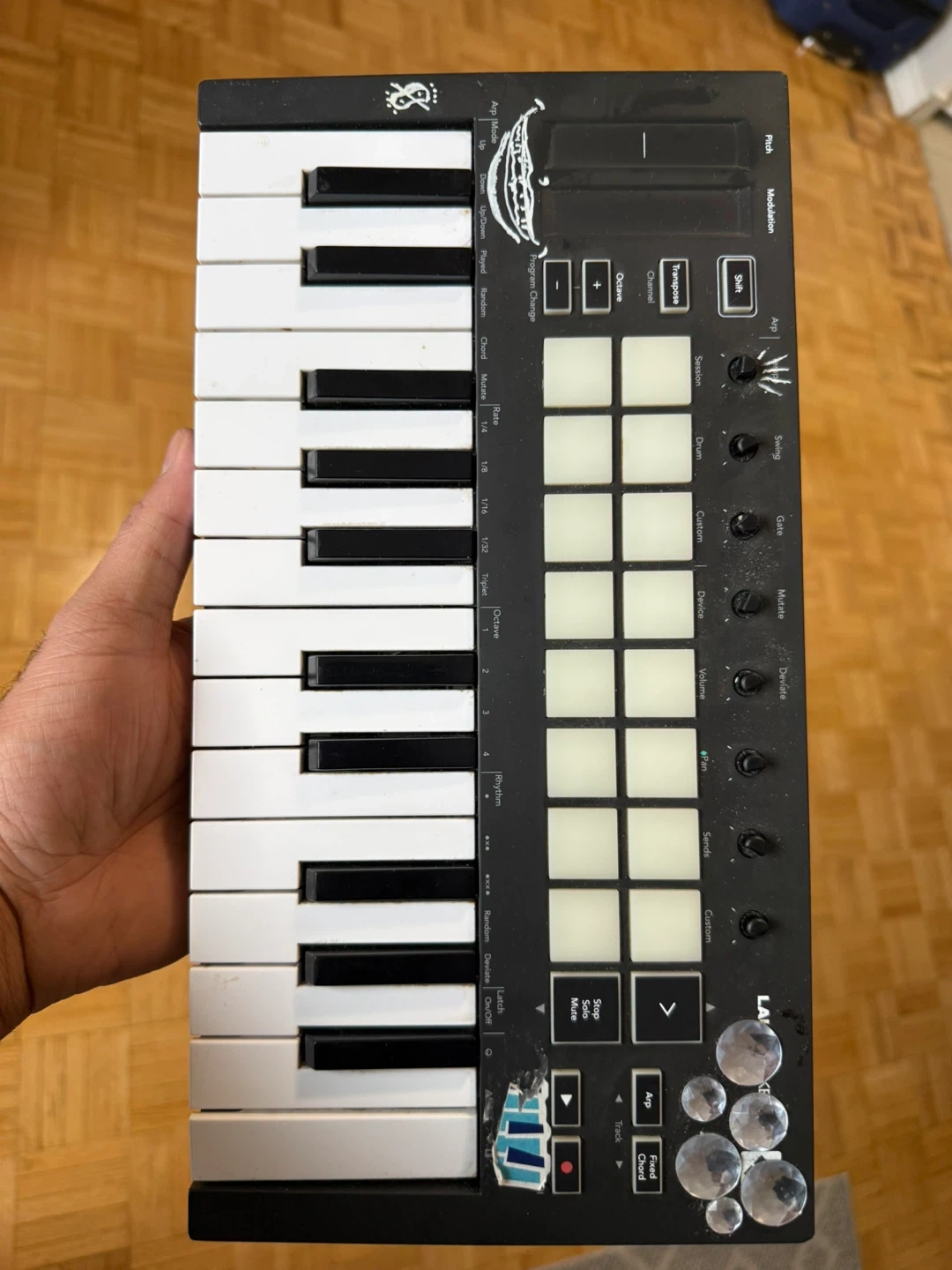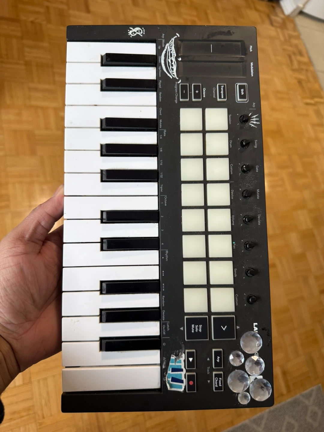 This is a Novation Launchkey Mini MIDI keyboard controller. It's a compact device with 25 mini keys and RGB-backlit pads. Great for music production on the go!